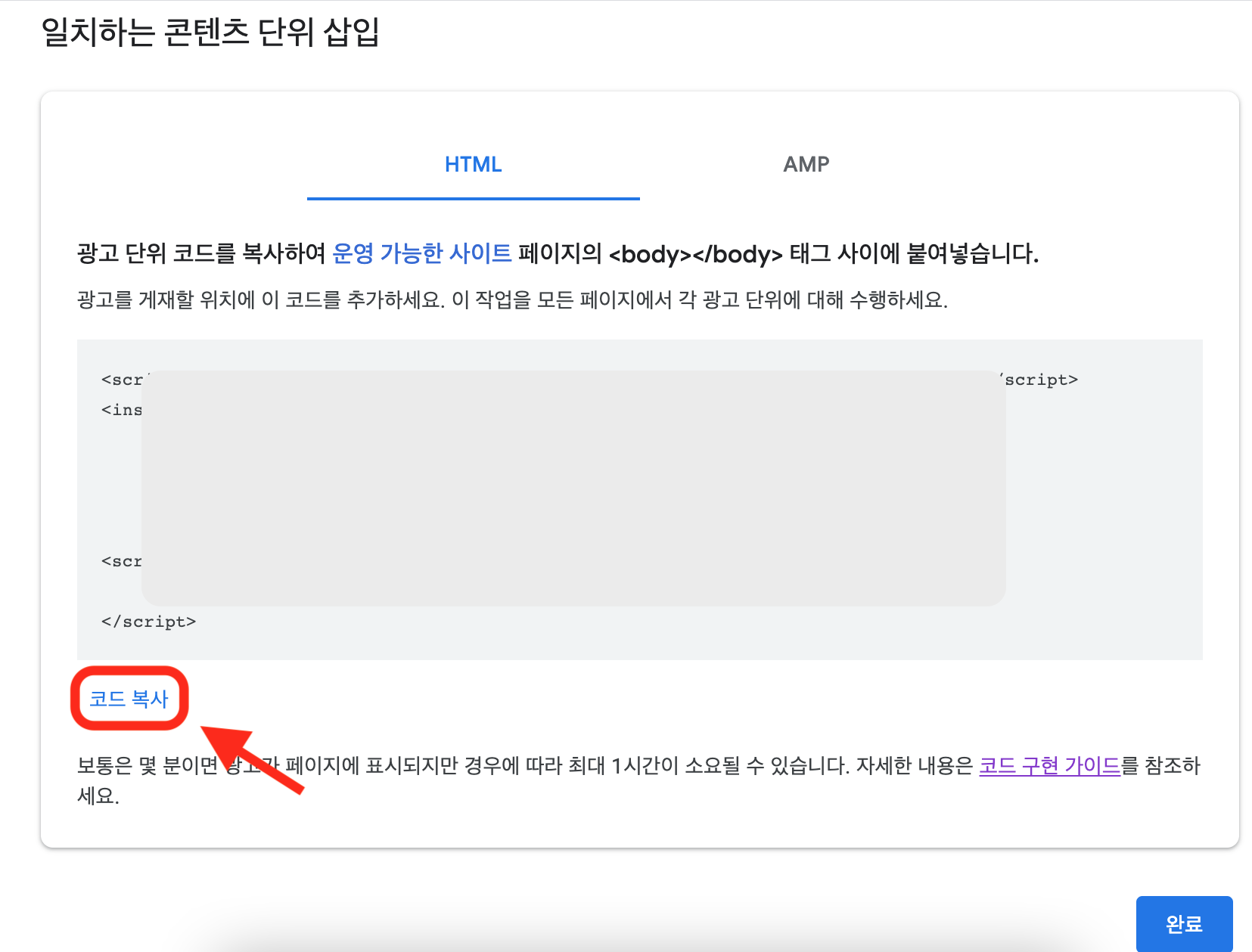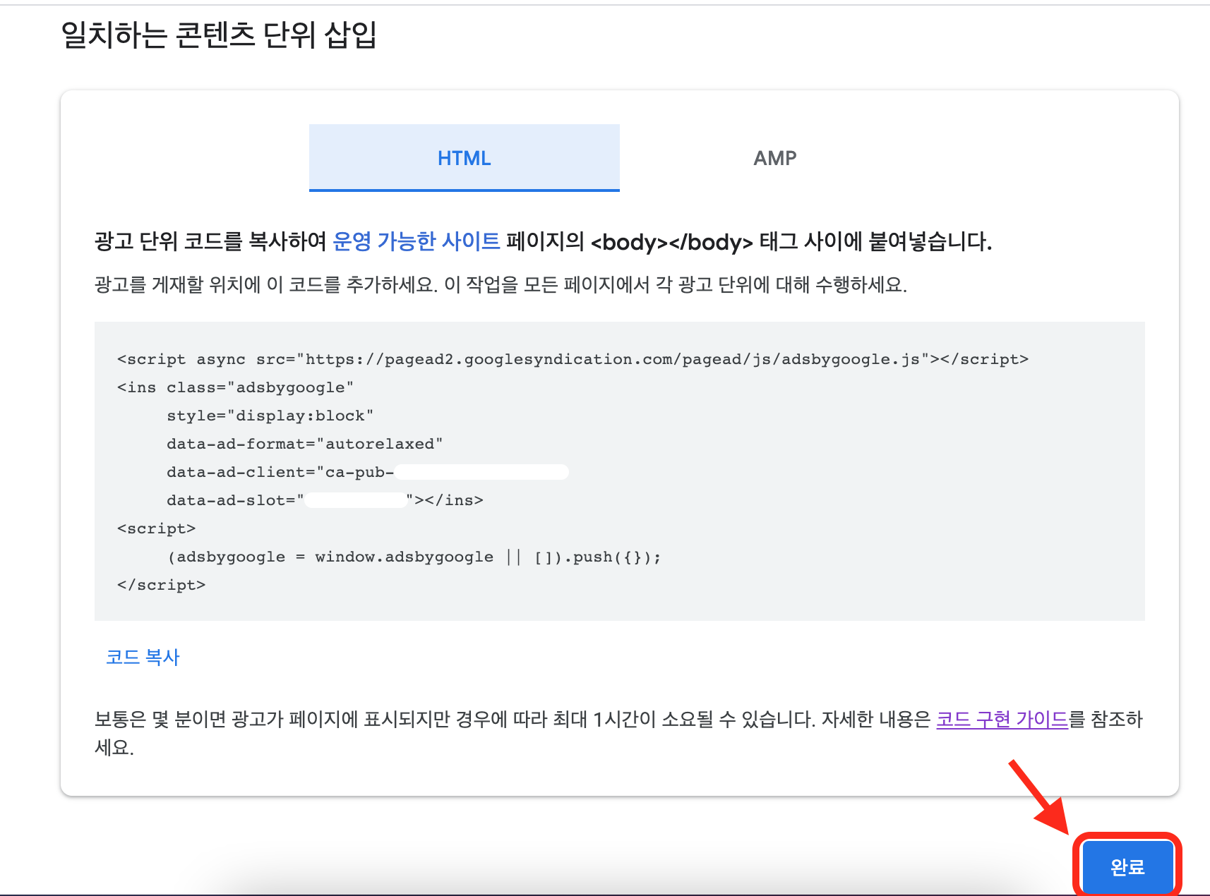 그럼 다시 구글 애드센스 페이지로 와서 '완료'를 눌러줍니다.!