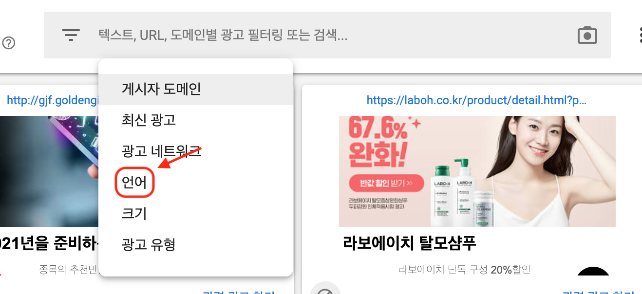 그럼 한국어를 제외한 모든 나라의 언어로 된 광고를 확인할 수 있습니다.