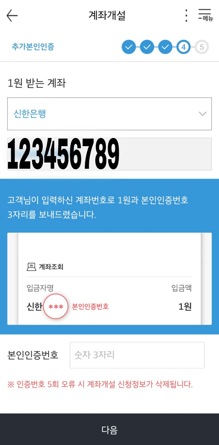 아까 기억하신 숫자 세자리 830을 본인인증번호에 입력하시면 됩니다. 와!! 드디어 계좌개설이 끝났습니다. 개설계좌에는 123456789이라는 계좌번호가 있을겁니다. 앞으로 그 번호가 주식거래를 하실때 예수금을 받으실 계좌 번호가 되는 겁니다. (예수금에 대해서는 다음 포스팅팅 해보겠습니다.)