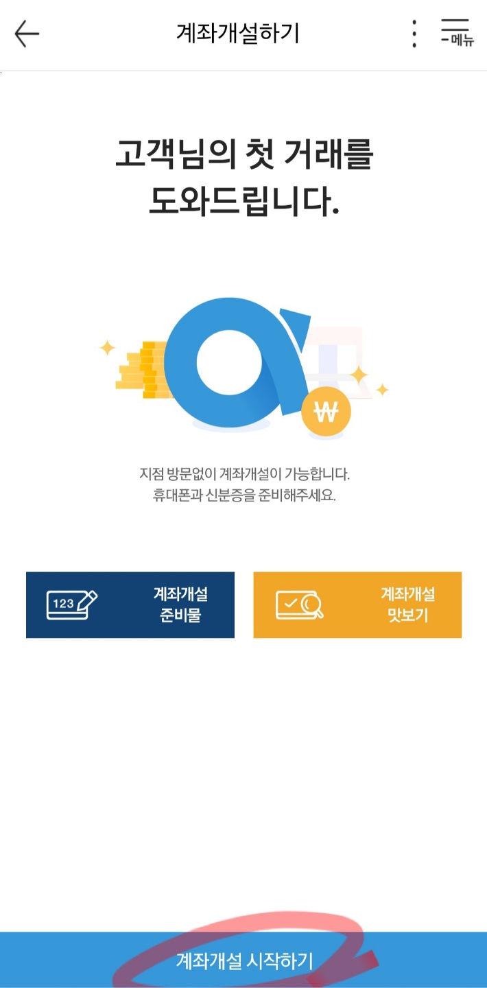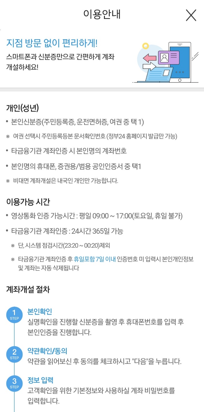 이렇게 준비물들과 계좌개설 절차가 나와있습니다. 참고할 분들은 참고하시면 됩니다. 자 그럼 빠르게 다시 뒤로가서 '계좌 개설 시작하기'를 눌러줍니다.