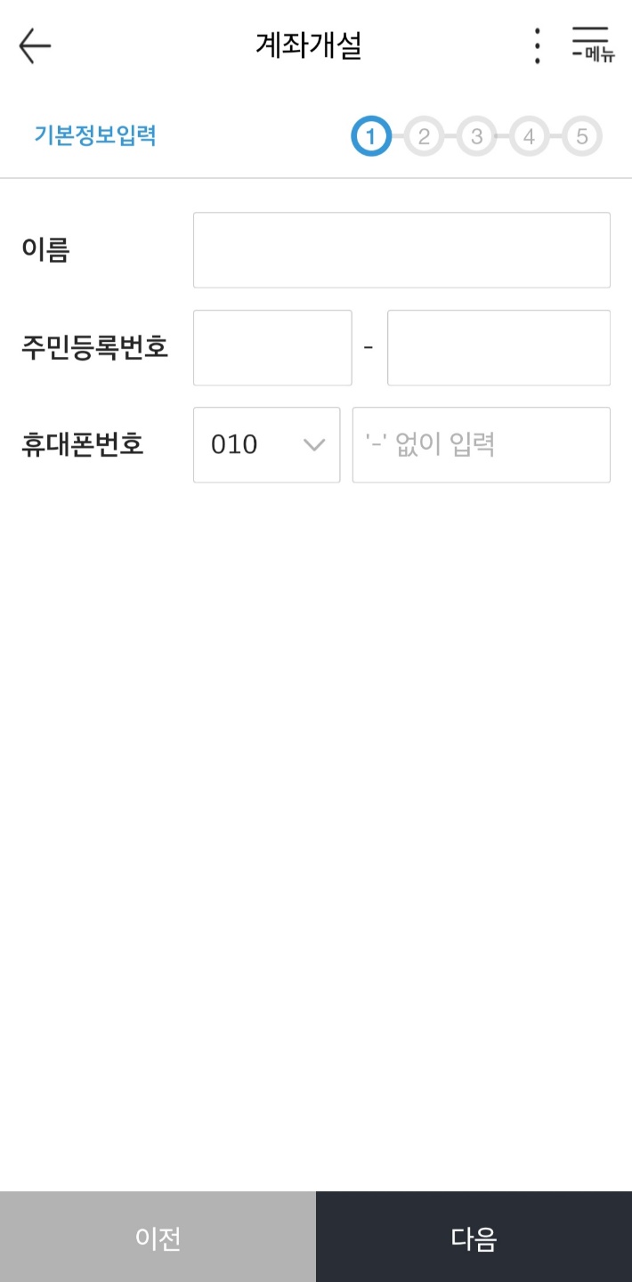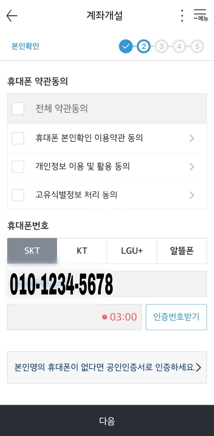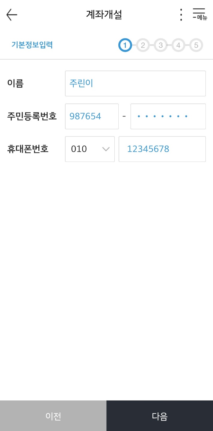 이제 본격적으로 계좌를 만들기 시작합니다. 기본정보 입력인 이름(주린이), 주민등록번호(987654), 휴대폰 번호(010-1234-5678)를 차례대로 입력해 주시면 됩니다.