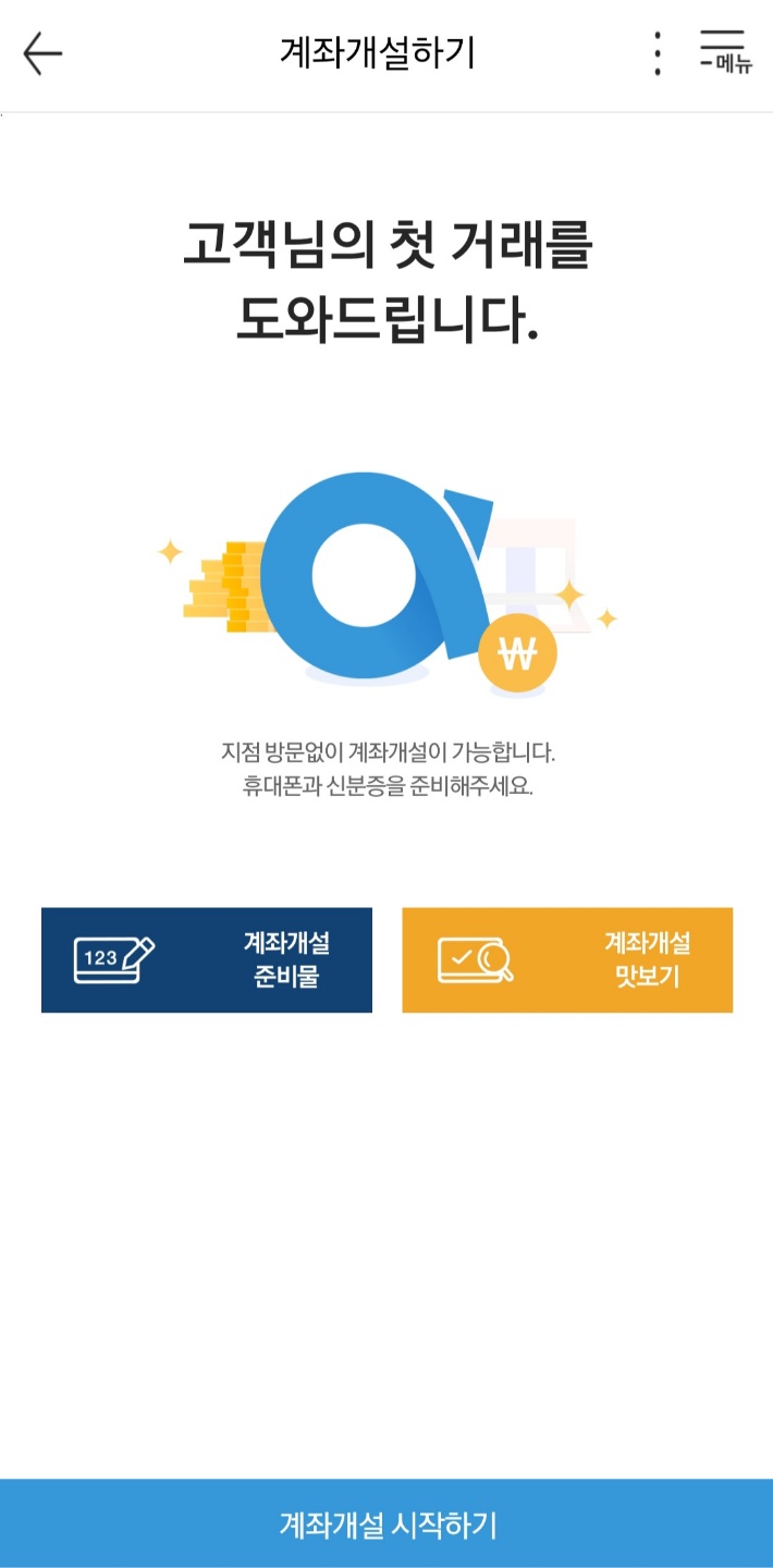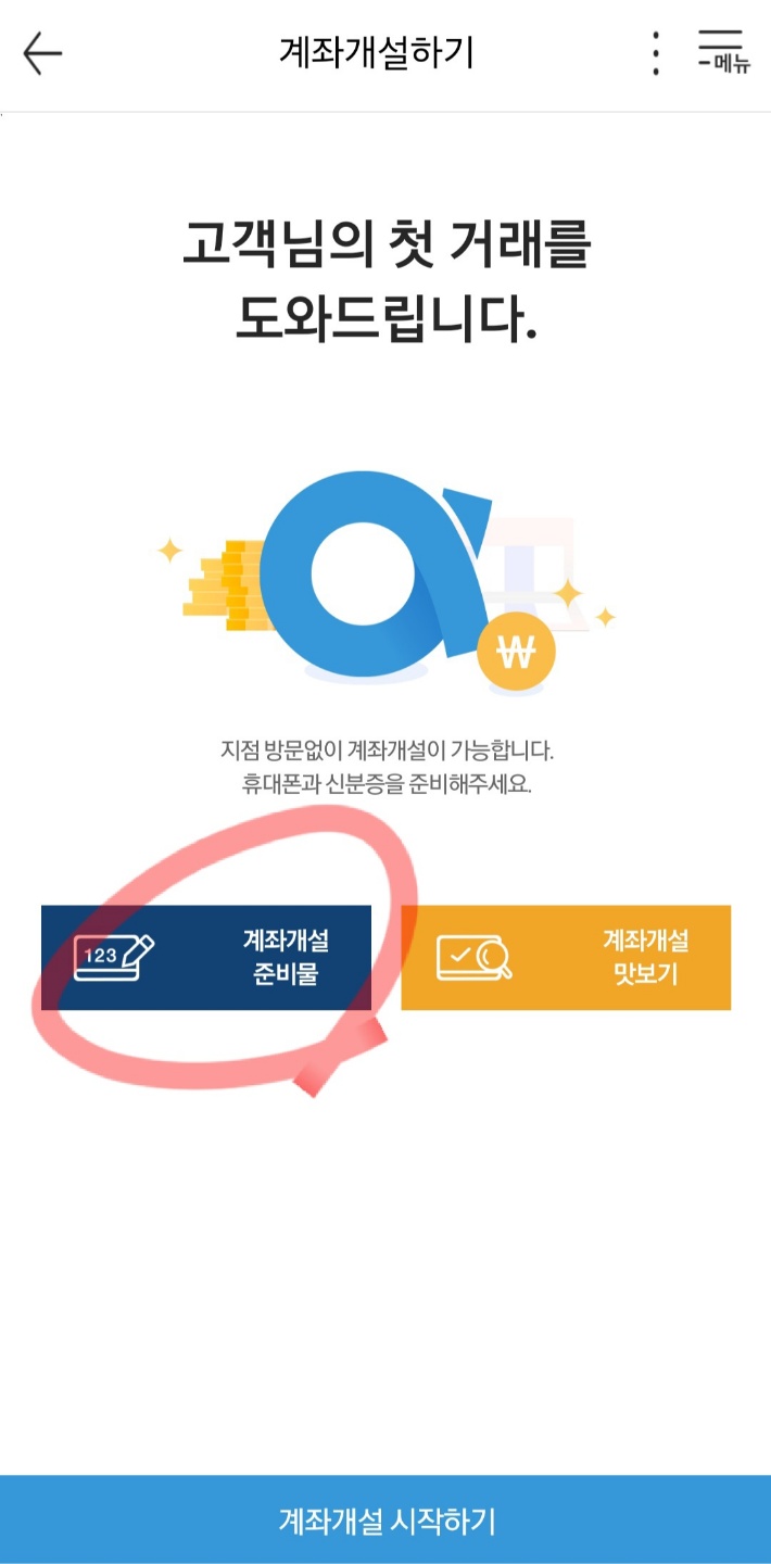 권한 허용이 됐으면 뒤로가기 버튼을 누르시면 2번째와 같은 창이 뜹니다. 그럼 계좌개설을 시작하기 전에 저희가 준비한 준비물을 가져옵니다.(신분증) 그 전에 준비물이 더 필요한지 확인하고 갈까요? 바쁘신 분들은 바로 계좌 개설 시작하기를 눌러주세요.