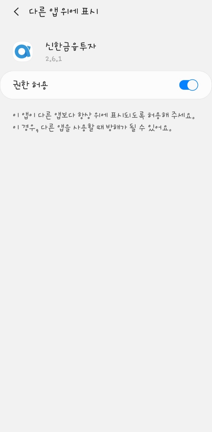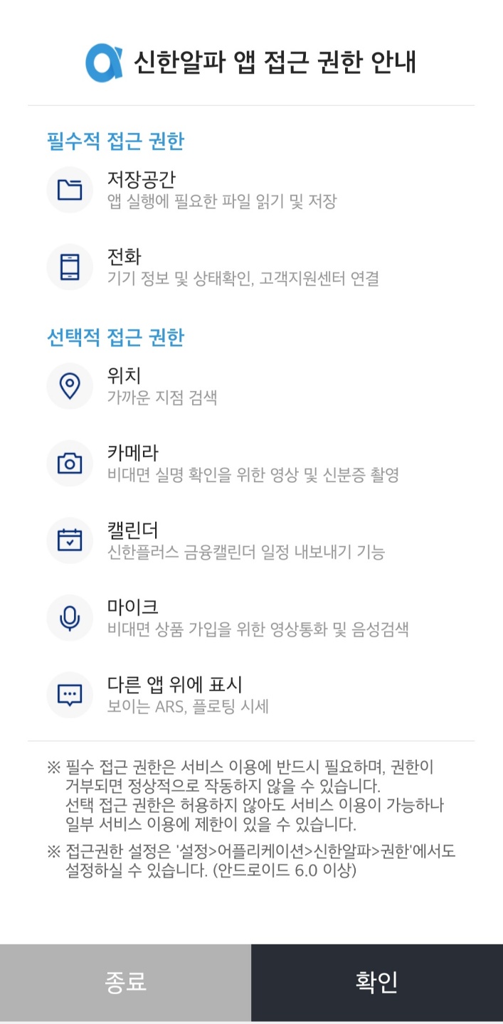 누르시면 바로 신한알파 앱 접근 권한 안내가 나옵니다 '확인'을 해주세요. 확인을 누르면 앱 자체 다운로드가 진행됩니다.