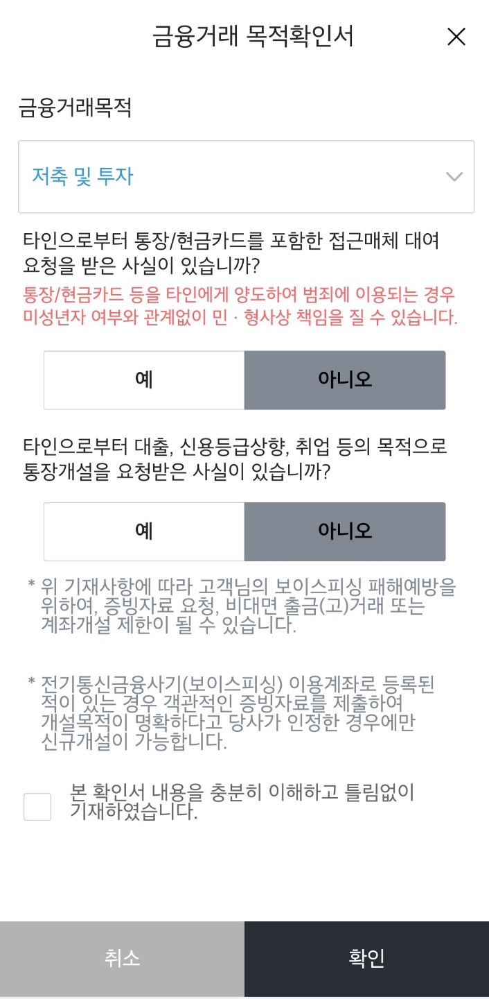 기본정보를 다입력하시고 '다음' 버튼을 누르시면 금융거래목적이 나오는데 특별한 목적이 있으신 분들을 제외하고는 기본적으로 저축 및 투자로 하시면 됩니다. 아래 질문들에는 '아니요'로 답하시면 되는데, 혹시 진짜로 타인에 의해 요청받아 계좌를 개설하시는 분들은 당장 멈추셔야 됩니다. 범죄에 악용될 수 있기 때문입니다. 다 되신분들은 '본 확인서 내용을 충분히 이해하고 틀림없이 기재하였습니다' 빈칸에 터치를 하셔고 확인을 눌러주시면 됩니다.