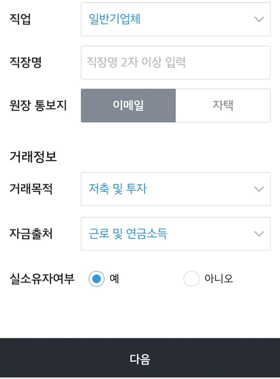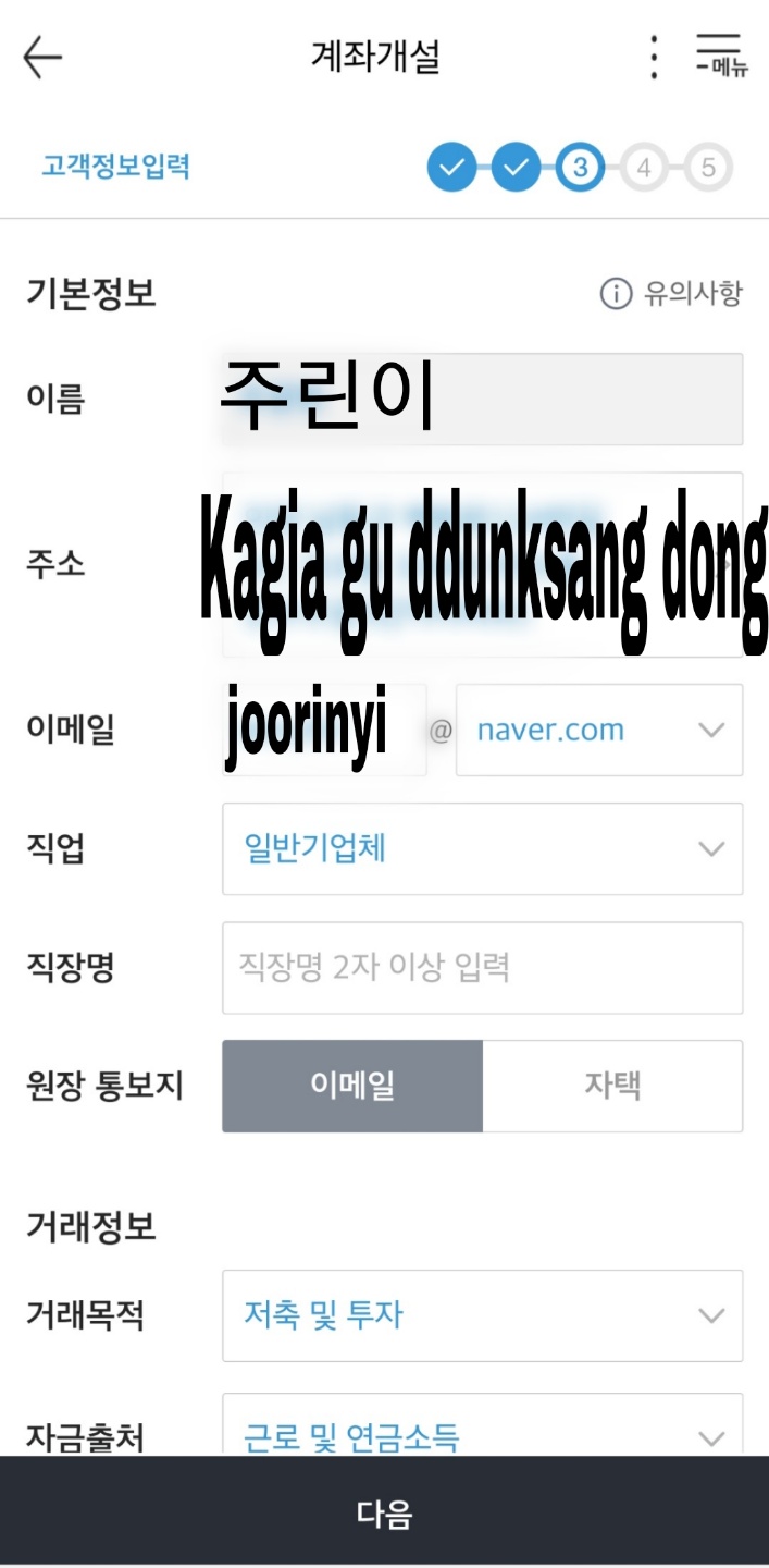 다음에는 이름, 주소, 이메일, 직업, 거래 목적, 자금출처 이렇게 나와있는데 적혀있는 부분은 수정하실 필요없고, 다른 부분들 비어있는 부분들만 입력해주시면 됩니다.