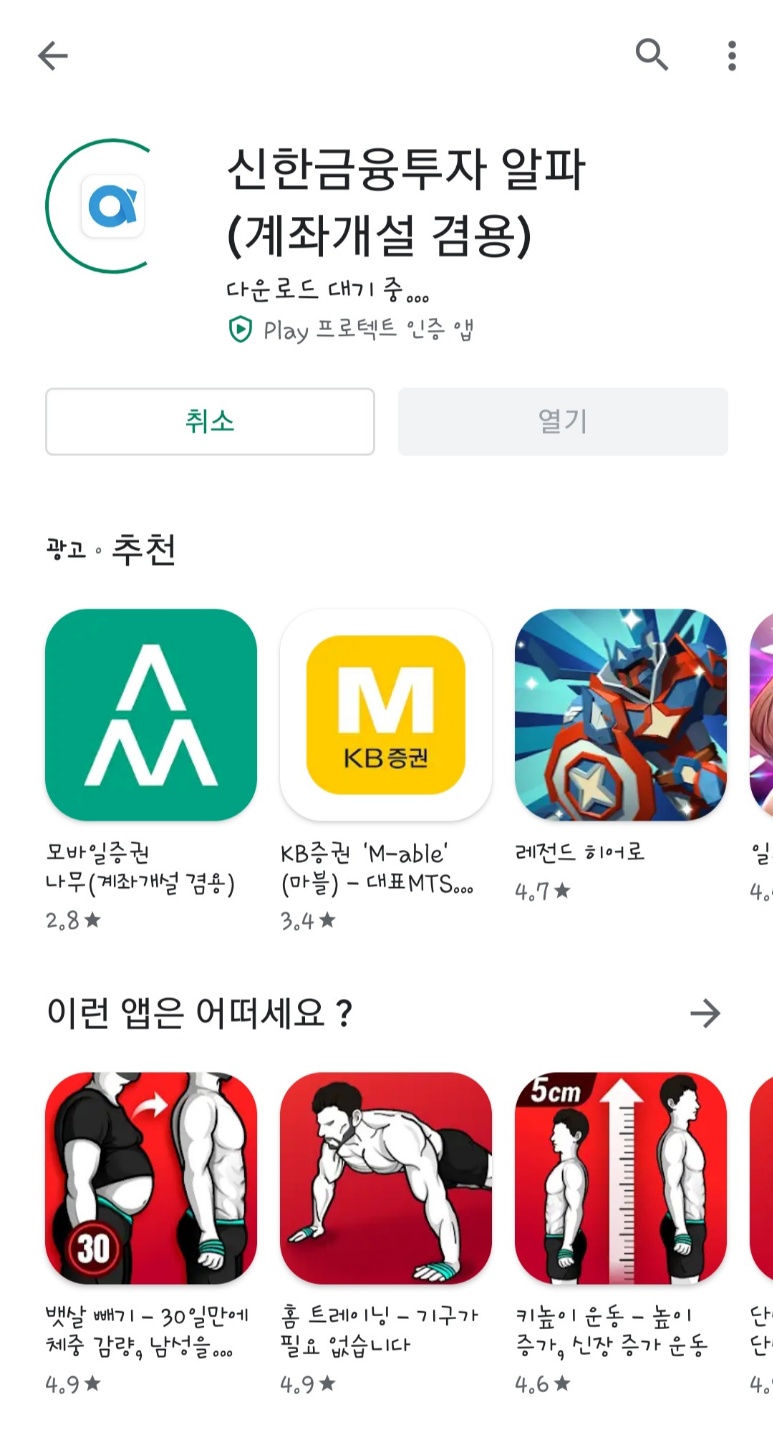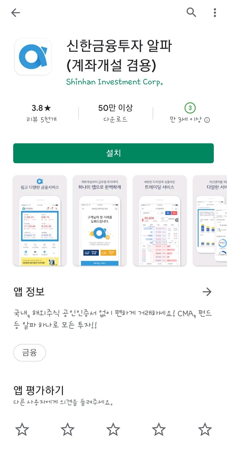 들어가면 검색창에 '증권사' 또는 '증권'이라고 치면 수 많은 증권사 어플이 나옵니다. 저는 신한금융투자를 사용하기 때문에 신한금융투자를 다운받았습니다. 원하시는 증권사가 있으시면 그것을 받으셔도 상관 없습니다. 하지만 오늘은 신한금융투자로 만드는 법을 알려드리기 때문에 타 증권사랑은 차이가 있을수 있으나, 거의 비슷한 절차로 진행되기 때문에 이해하시는 것은 전혀 문제 없을 듯 합니다.
