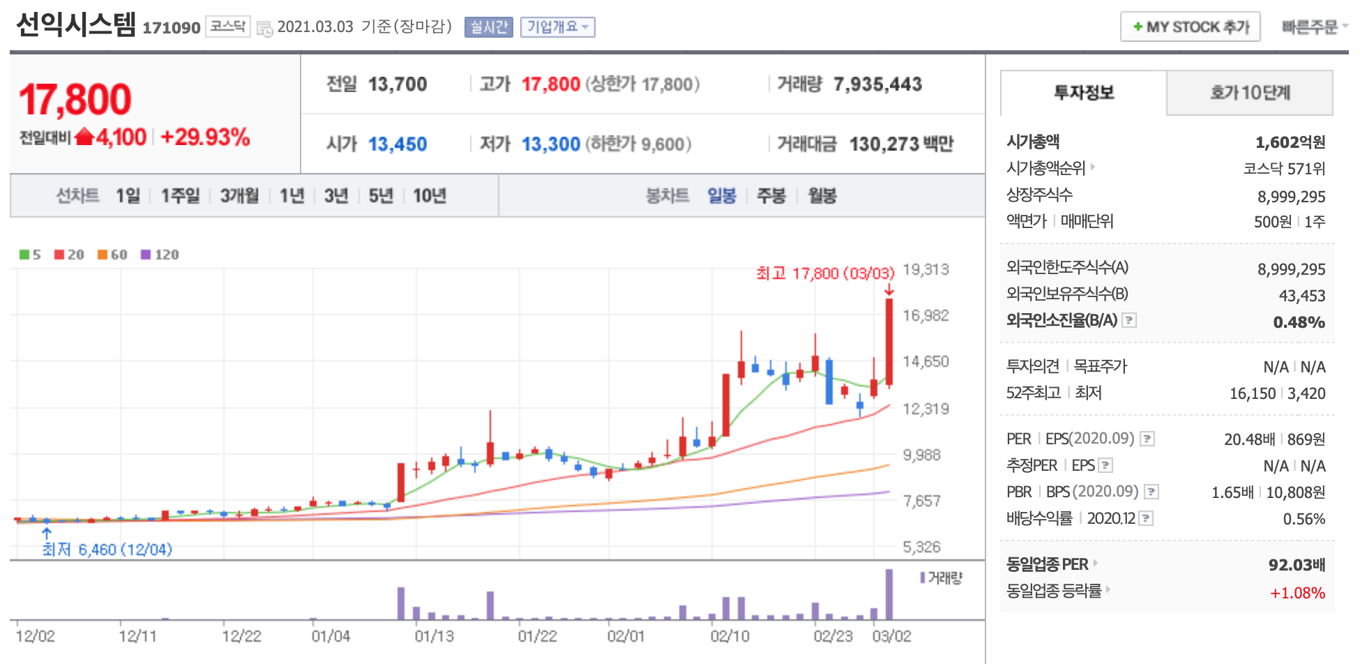 메타버스 관련주로 부각받으며 상한가를 기록한 것으로 풀이된다. 메타버스에 접속할 수 있는 AR, VR 기기가 주목받으며 OLED 제조장비를 생산하는 선익시스템이 부각된 것으로 보인다. 메타버스는 가공, 추상을 의미하는 메타(Meta)와 현실 세계를 의미하는 유니버스(Universe)의 합성어다.