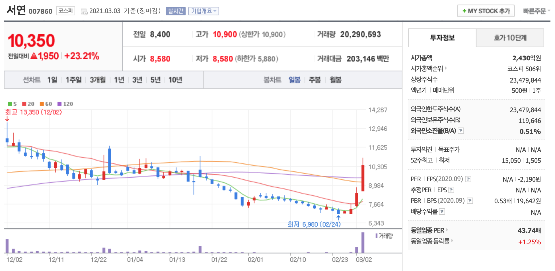 회사측의 부인에도 불구하고 ‘윤석열 테마주’로 거론되는 서연의 주가가 급등했다.
