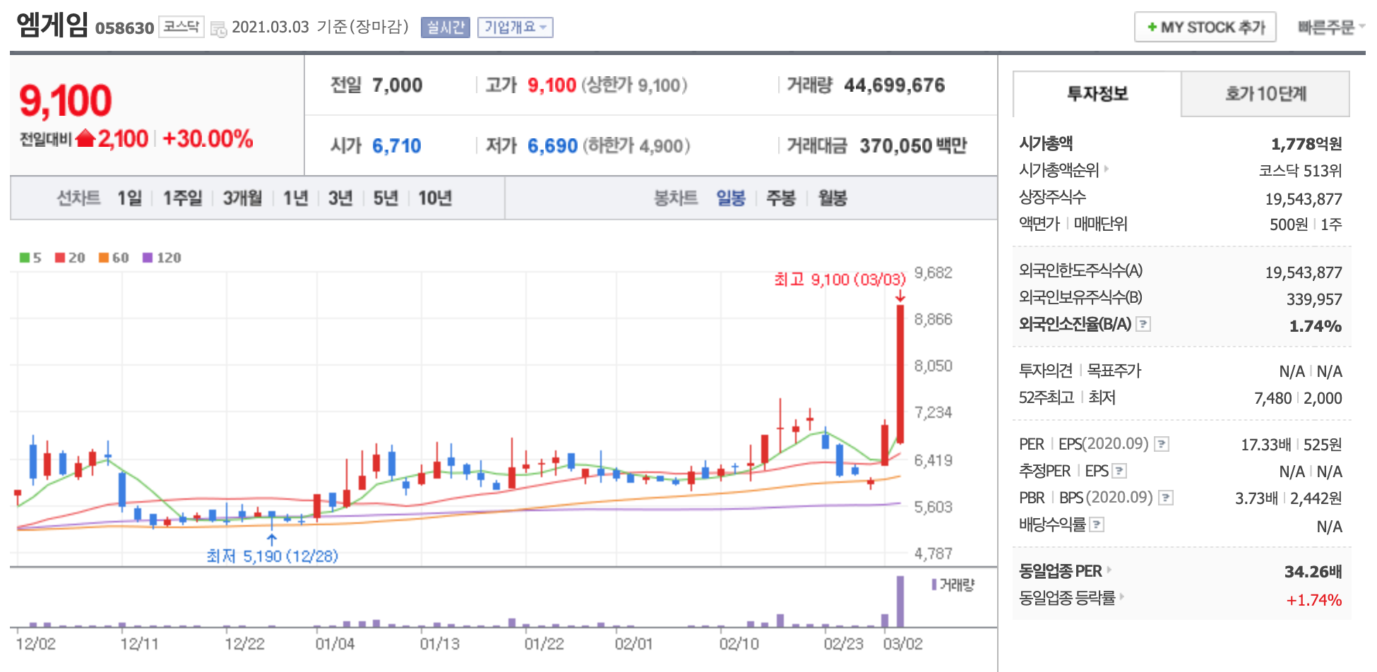 엠게임이 강세다. 오는 10일 뉴욕증시에 게임사 로블록스가 상장하기로 하면서 메타버스에 대한 관심이 커지고 있다.