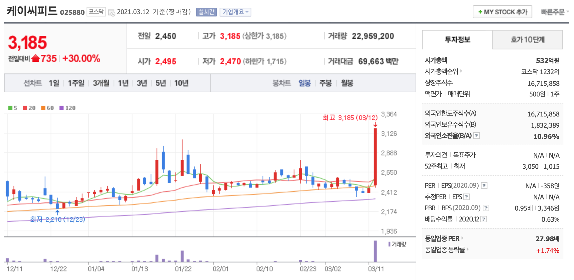케이씨피드 주가가 가파른 상승세를 보였다. 케이씨피드는 지난해 연결기준 영업이익이 14억1455만원으로 전년 대비 흑자전환했다.