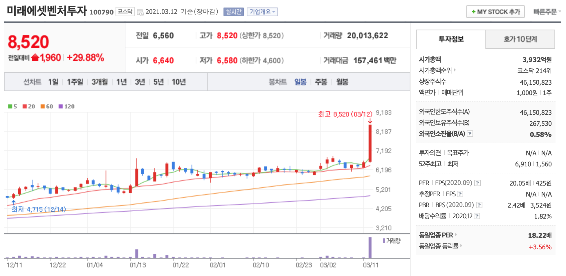 마켓컬리가 증시 상장을 검토하고 있다는 소식에 미래에셋벤처투자가 급등세다.