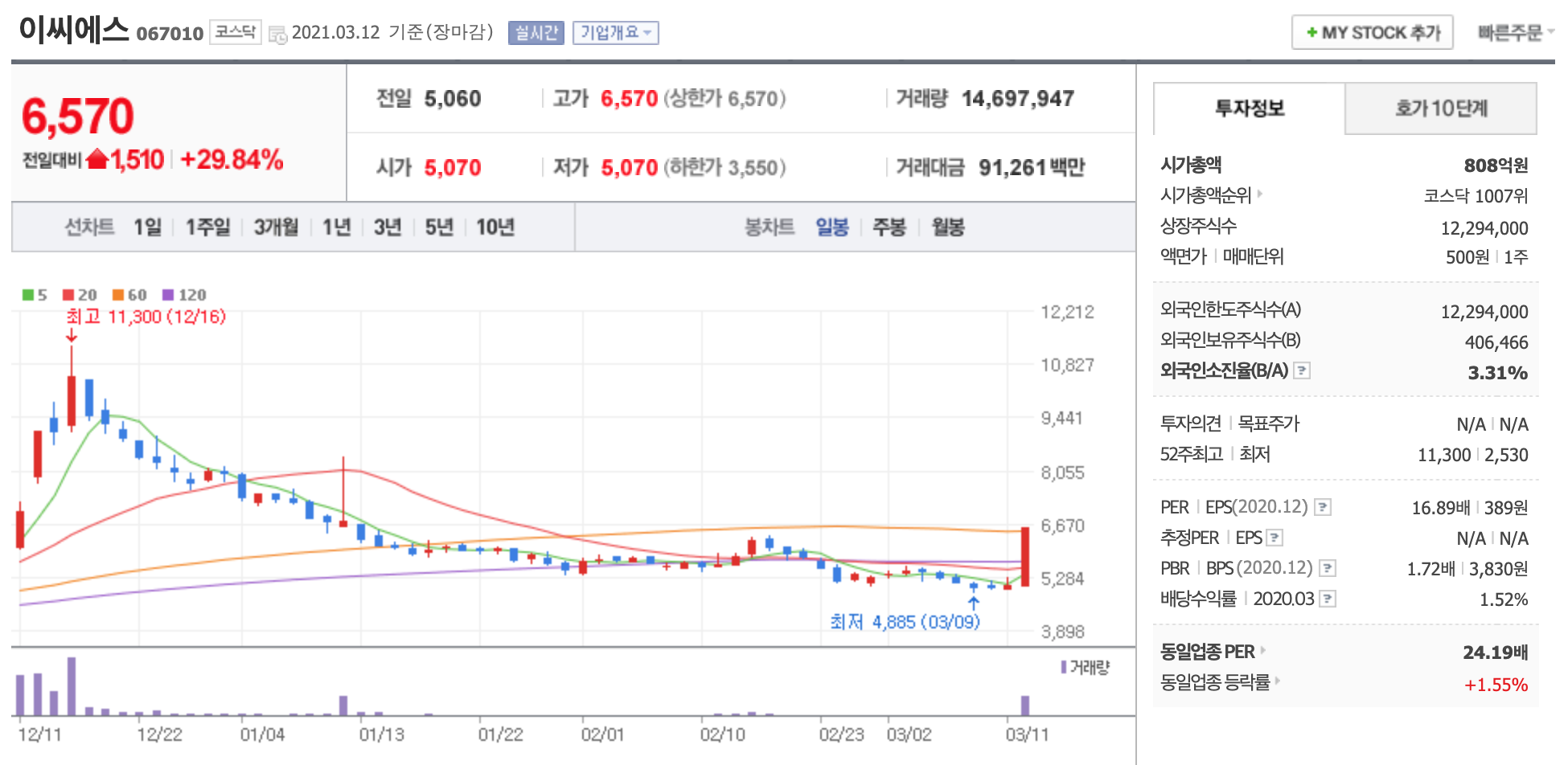 이씨에스주가가 강세다. 쿠팡에 이어 마켓컬리도 미국 증시에 상장한다는 소식에 콜센터를 구축한 이력이 부각된 것으로 보인다.