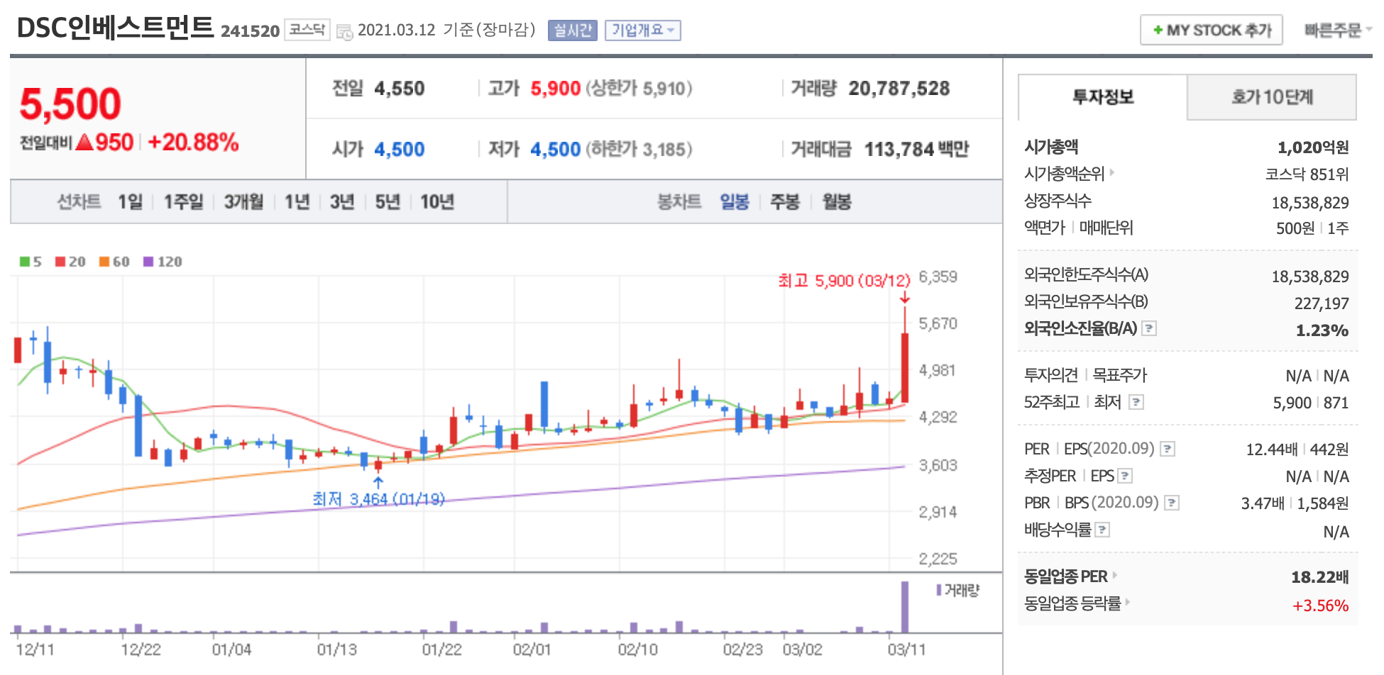 DSC인베스트먼트가 52주 신고가를 경신했다. 코스닥 지수가 1.5% 반등한 가운데 DSC인베스트먼트가 투자한 마켓컬리의 미국 상장 기대감에 주가가 강세인 것으로 풀이된다.