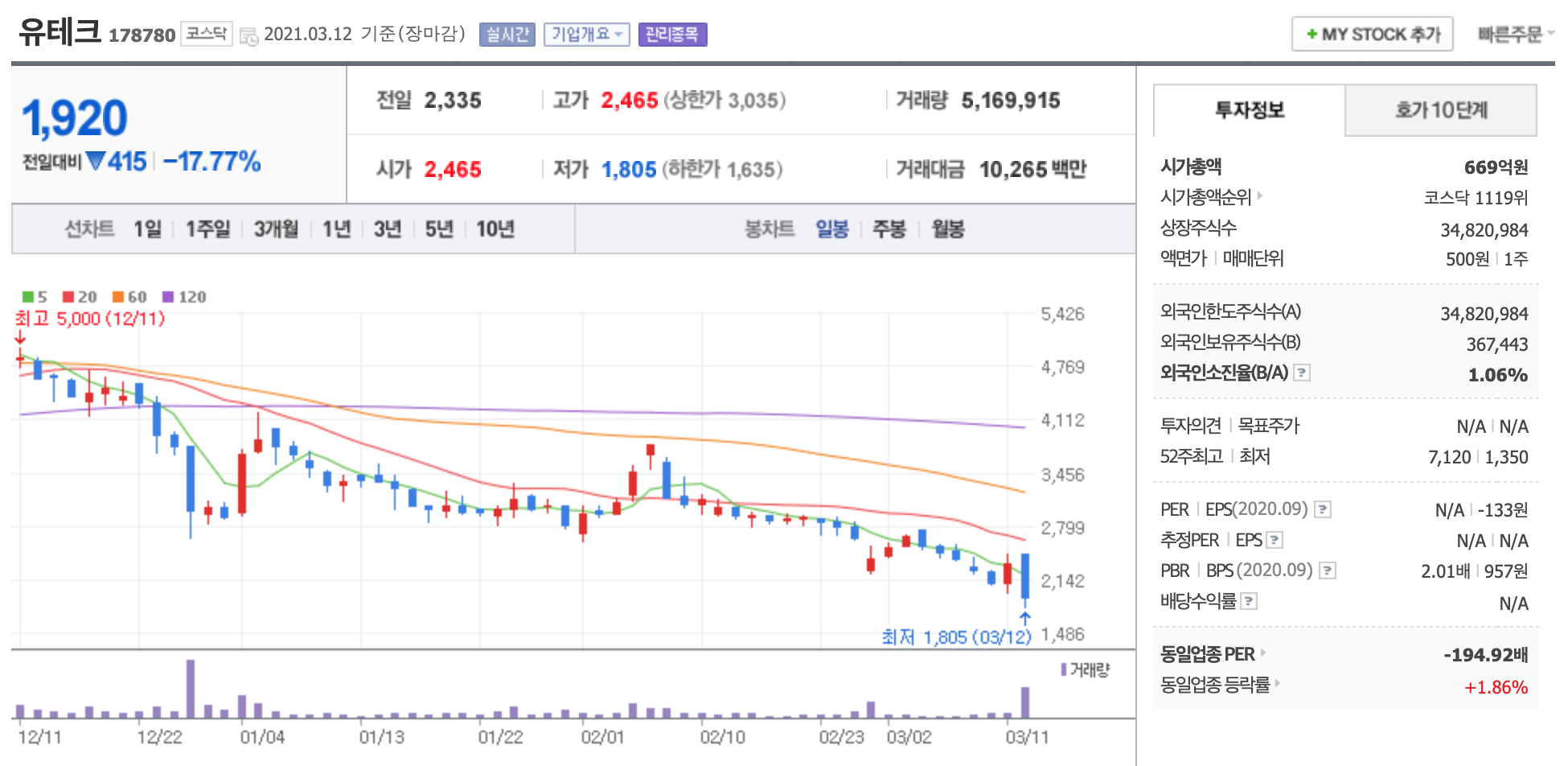 유테크. -17% 급락중 하락이유에 이목 집중 (관리종목)