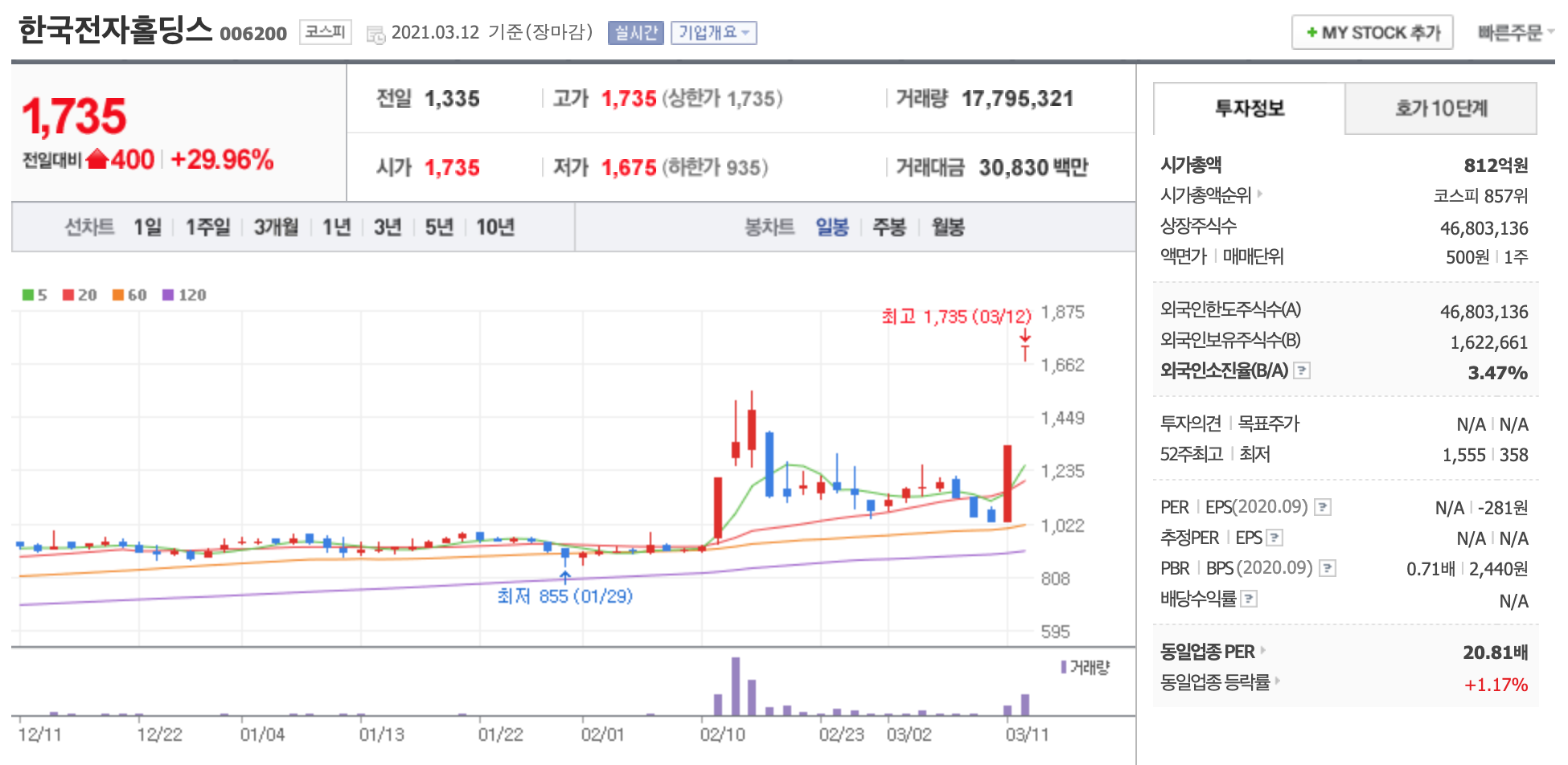 한국전자홀딩스가 쿠팡 미국 증시 상장 소식에 급등하고 있다.