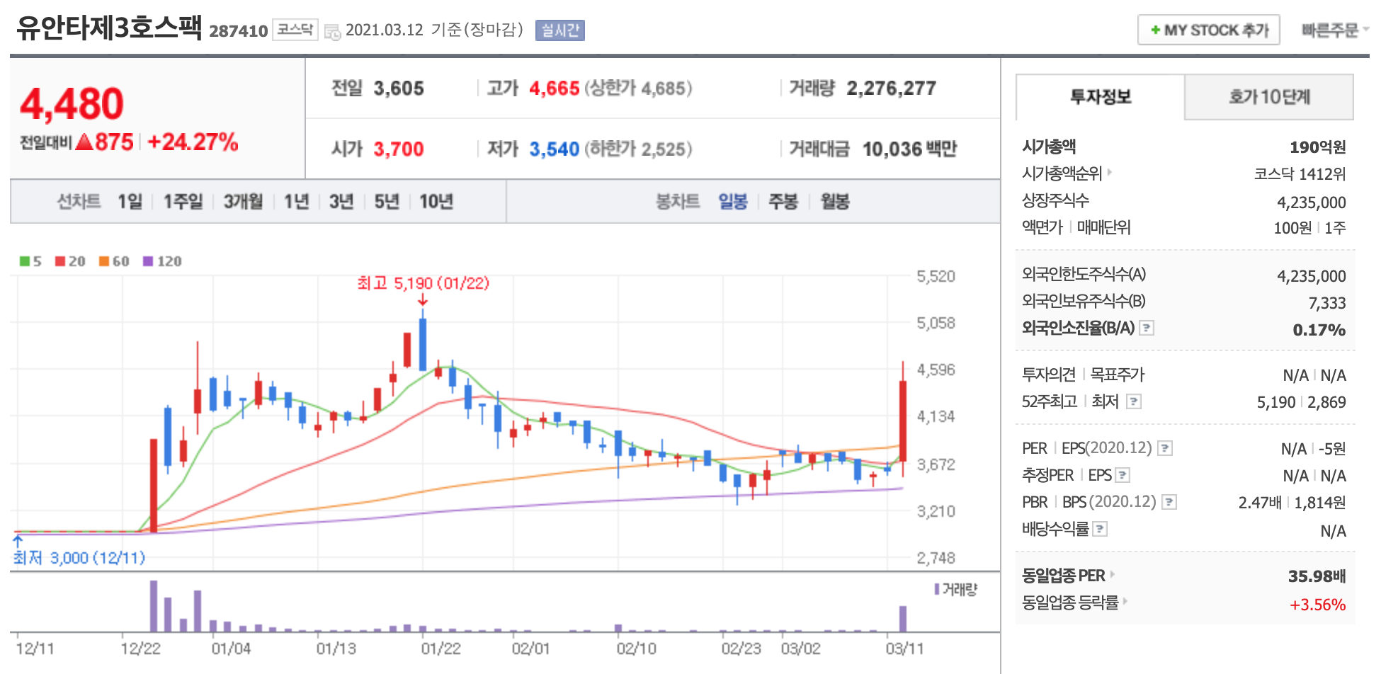 유안타제3호스팩 주가가 강세다. 앞서 피부미용 의료기기 업체 제이시스메디칼이 이달 말 유안타제3호기업인수목적(스팩)과 합병해 코스닥 시장에 입성한다고 밝혔다.