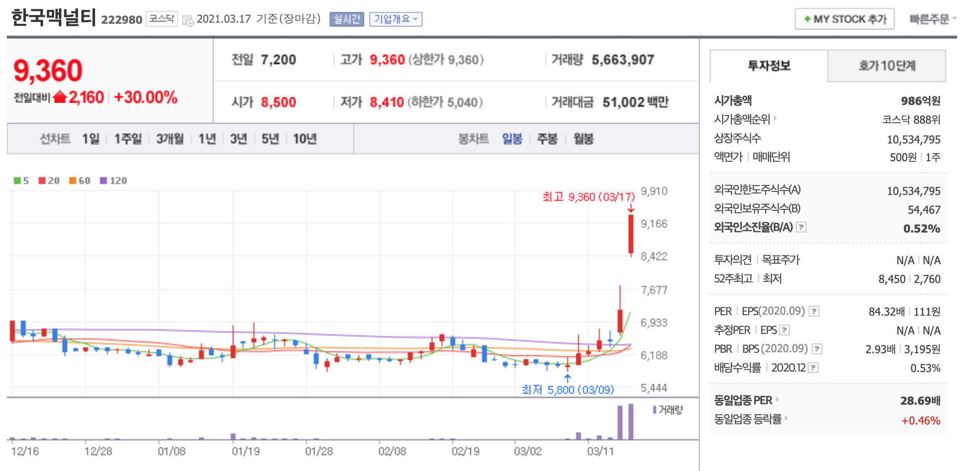 한국맥널티, 이베이코리아 인수전 열기에 덩달아 상한가