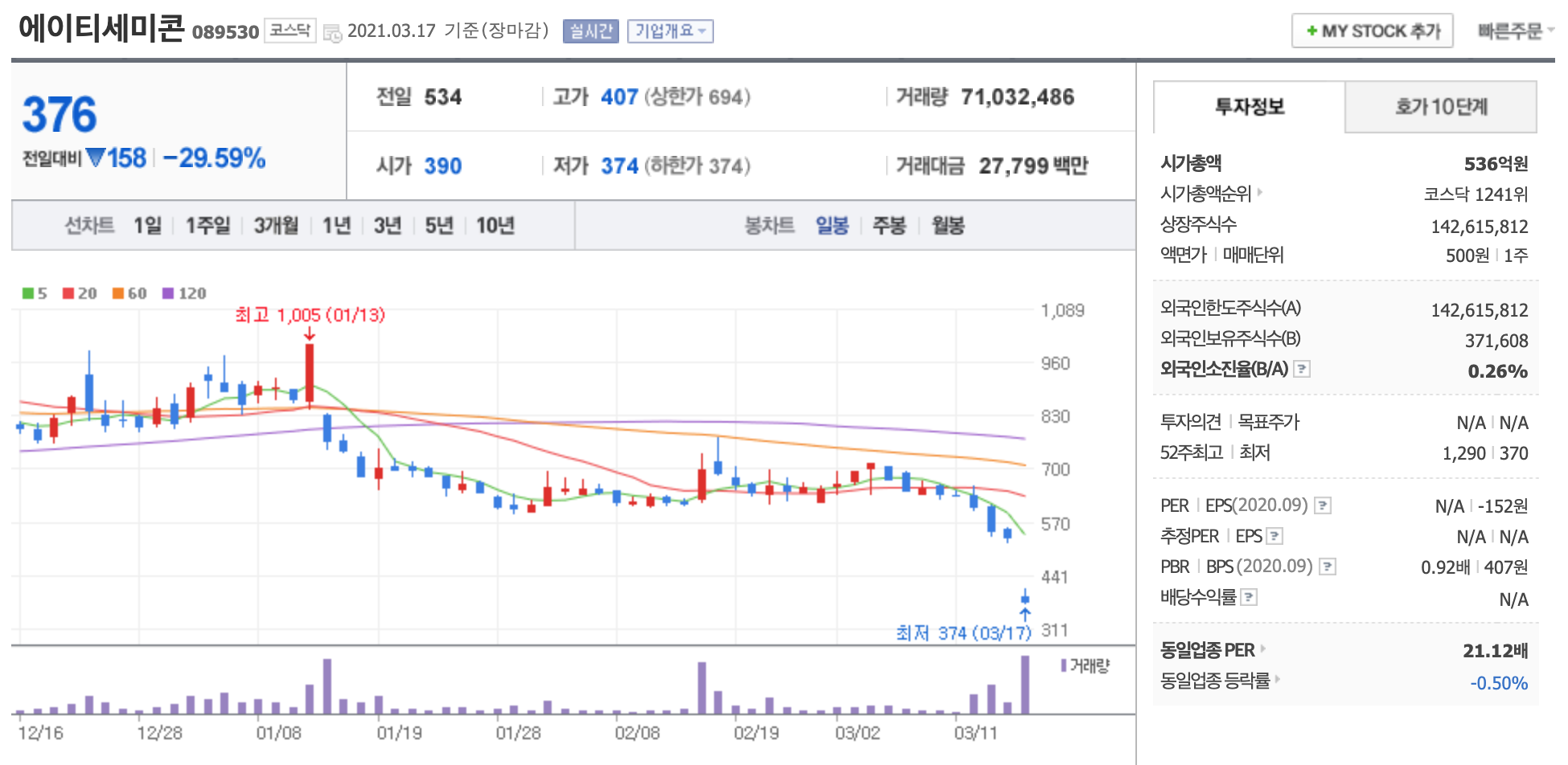 에이티세미콘, 보통주 10주→1주 무상감자 결정에 '급락'