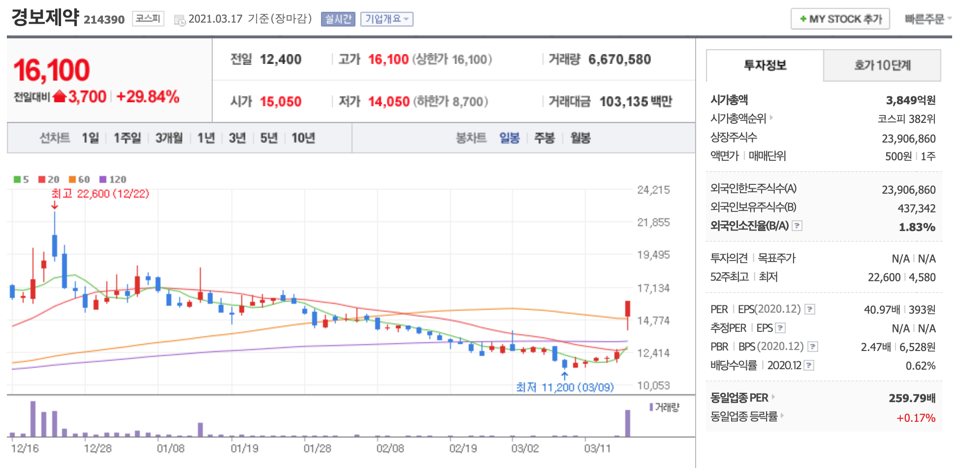 종근당그룹 계열사 경보제약 주가가 상한가에 육박하고 있다.