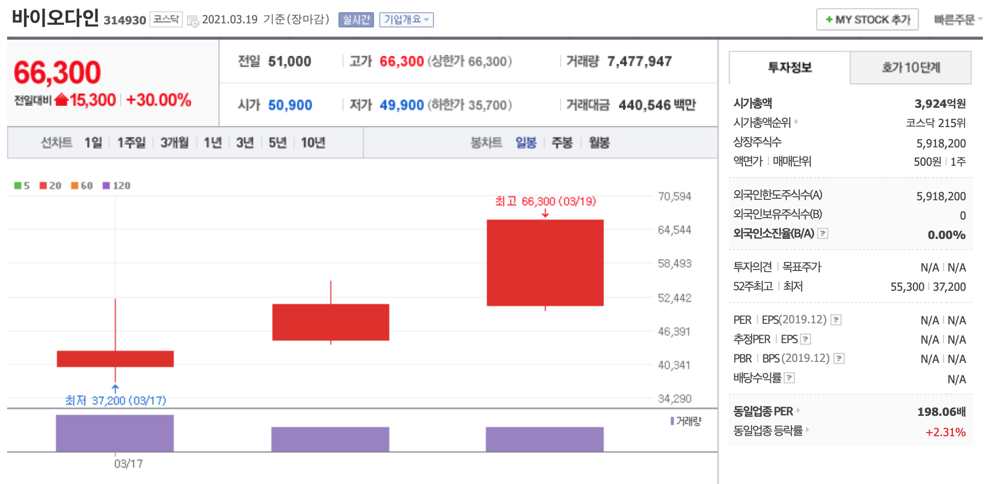 바이오다인, 코스닥 상장 '강세' (03.18)
