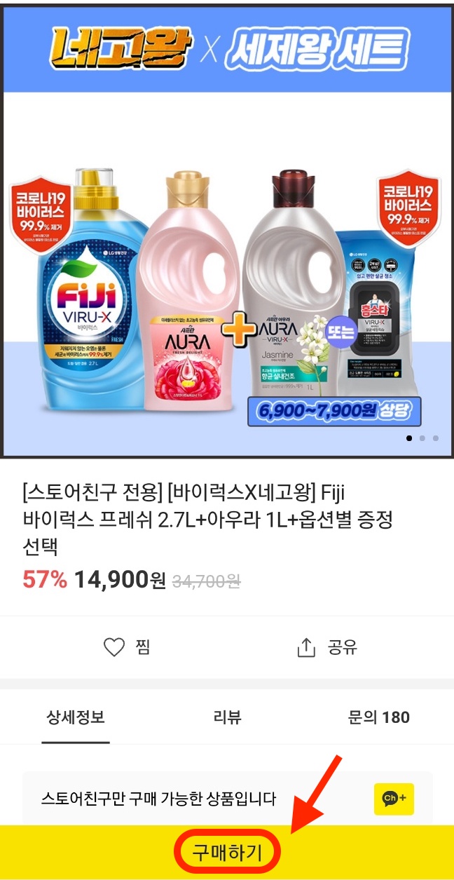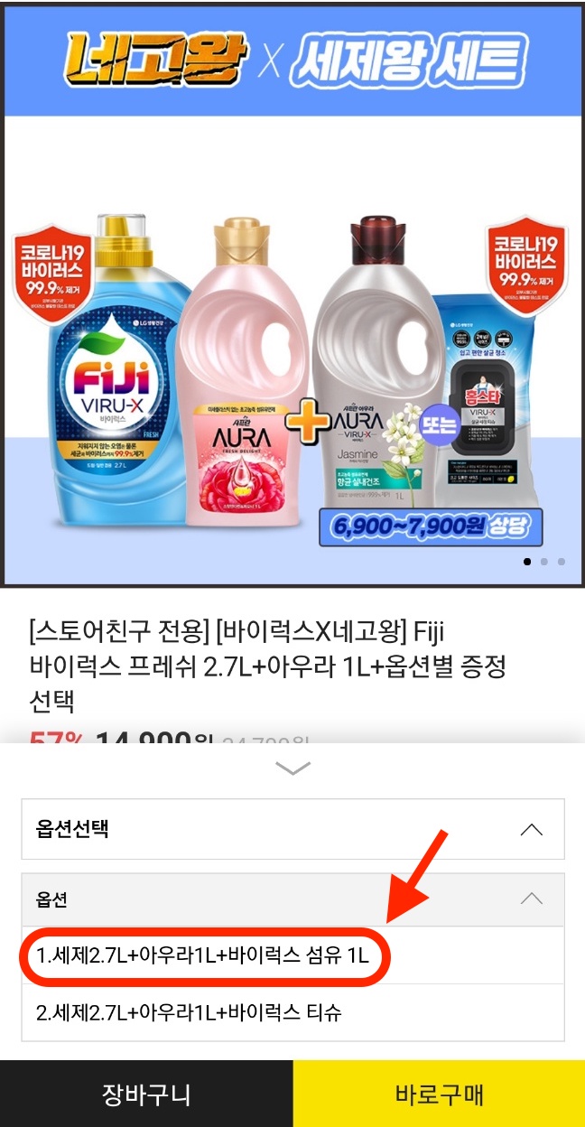 협상 1 - 세제왕 세트 (Fiji 바이럭스 세제 2.7L + 샤프란 아우라 섬유유연제 1L + 아우라 바이럭스 섬유유연제 1L or 홈스타 바이럭스 청소 티슈 50매) - 14,900원