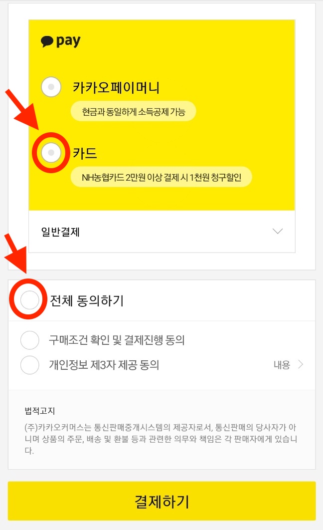 저는 카드로 결제를 선택했습니다. 그 뒤 '전체 동의하기'를 체크해 주세요.