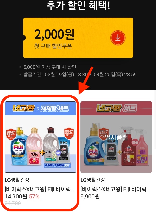 협상 2 - 네고왕 세트 (Fiji 바이럭스 세제 1L + 홈스타 바이럭스 청소 티슈 50매 + 자연퐁 뿌려 쓰는 주방세제 500ml or 홈스타 뿌리는 곰팡이 싹 750ml) - 9,900원 (단, 선착순 9,999개 한정)