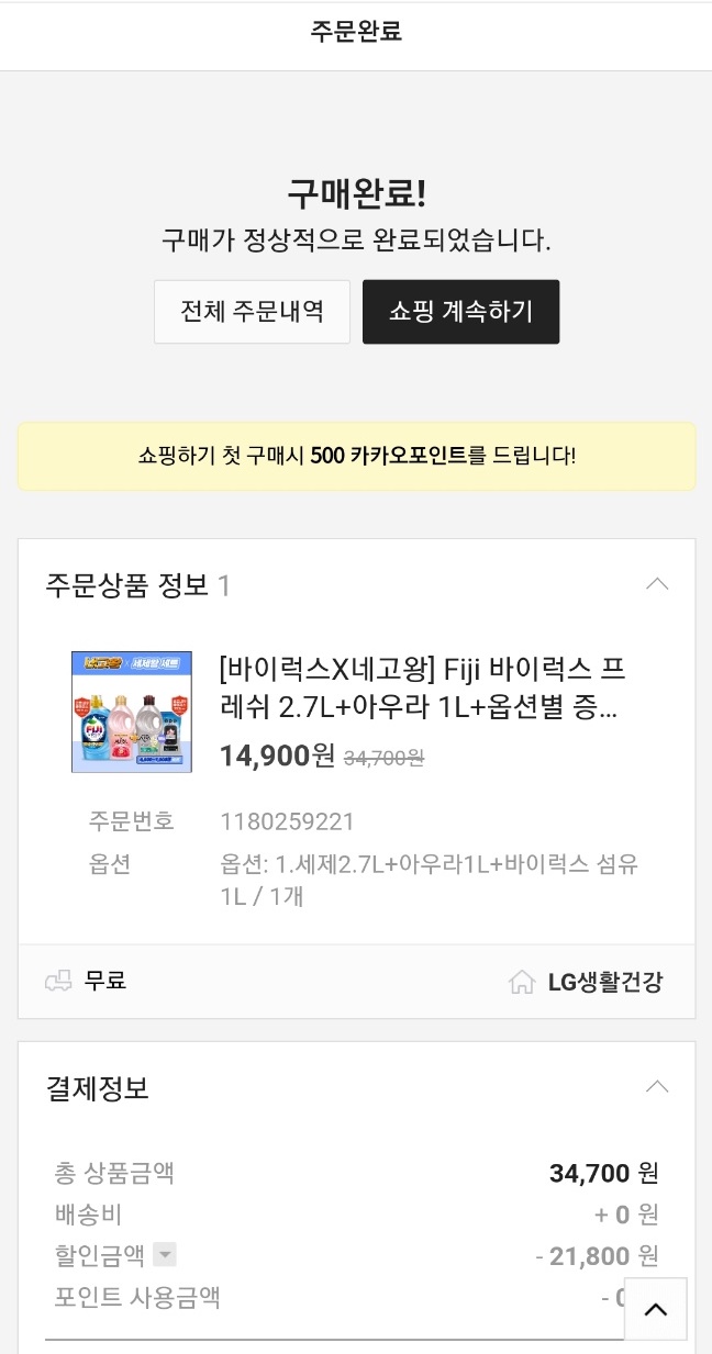 거기다 쇼핑하기 첫 구매 시 500 카카오 포인트를 준다고 하니, 500원을 더 벌은 느낌이네요. ㅎㅎ