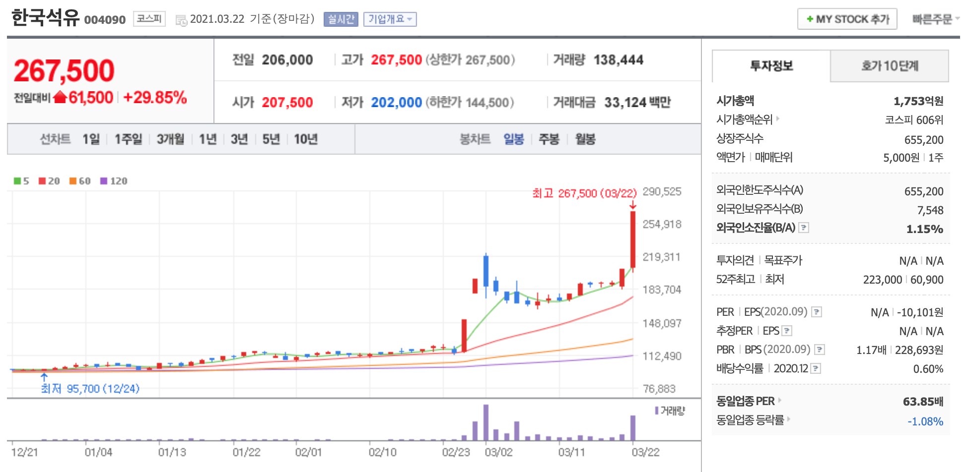앞서 한국석유는 지난달 25일 10분1 비율의 주식 액면분할과 1대1 비율의 무상증자를 실시한다고 밝혀 급등한 적이 있었다.
