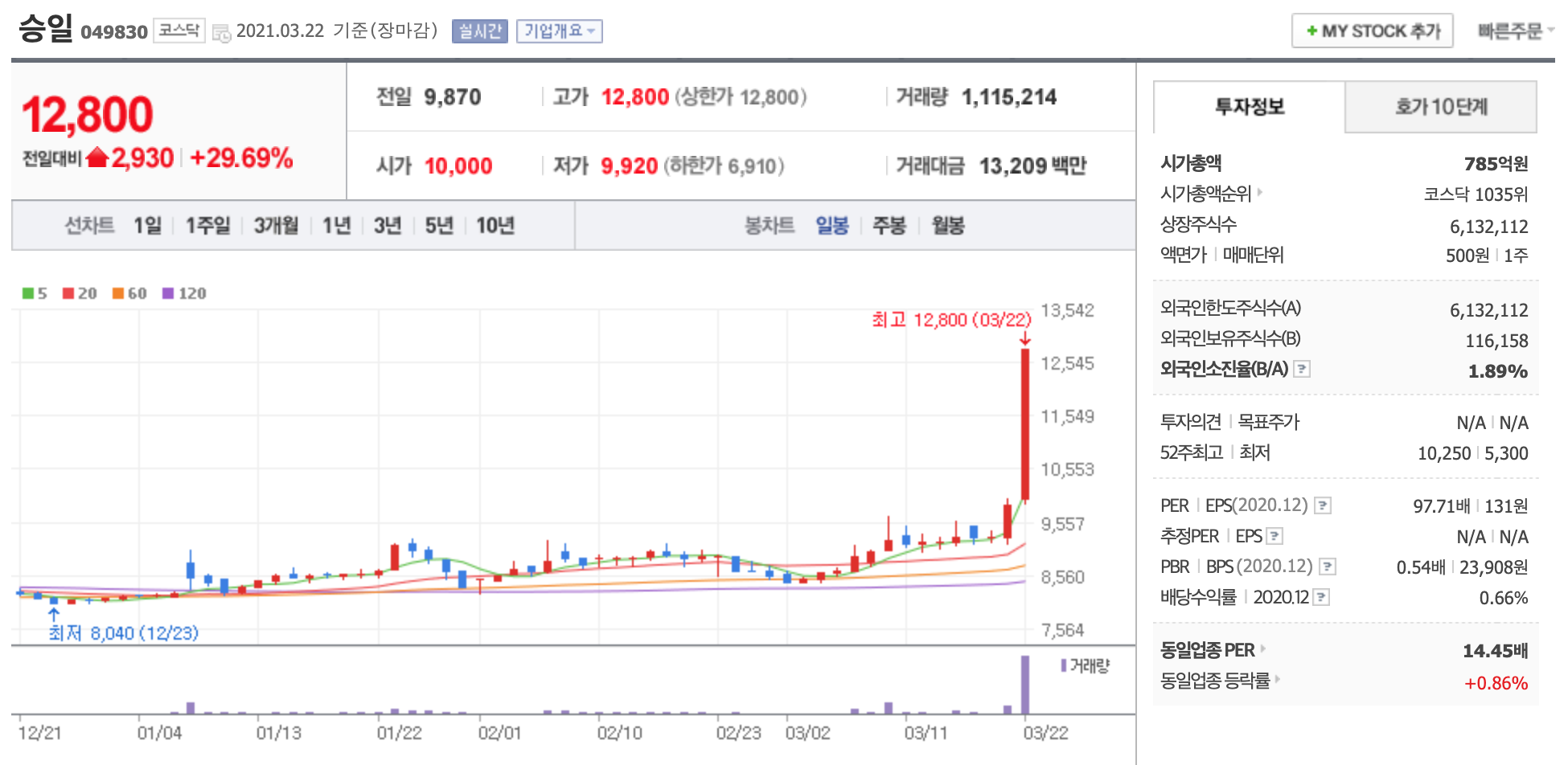 승일이 22일 오전 10시께 +29.69%상승한 1만2800원에 거래되며 강세를 보였다. 이에 많은 투자자들이 승일에 이목을 집중했다.