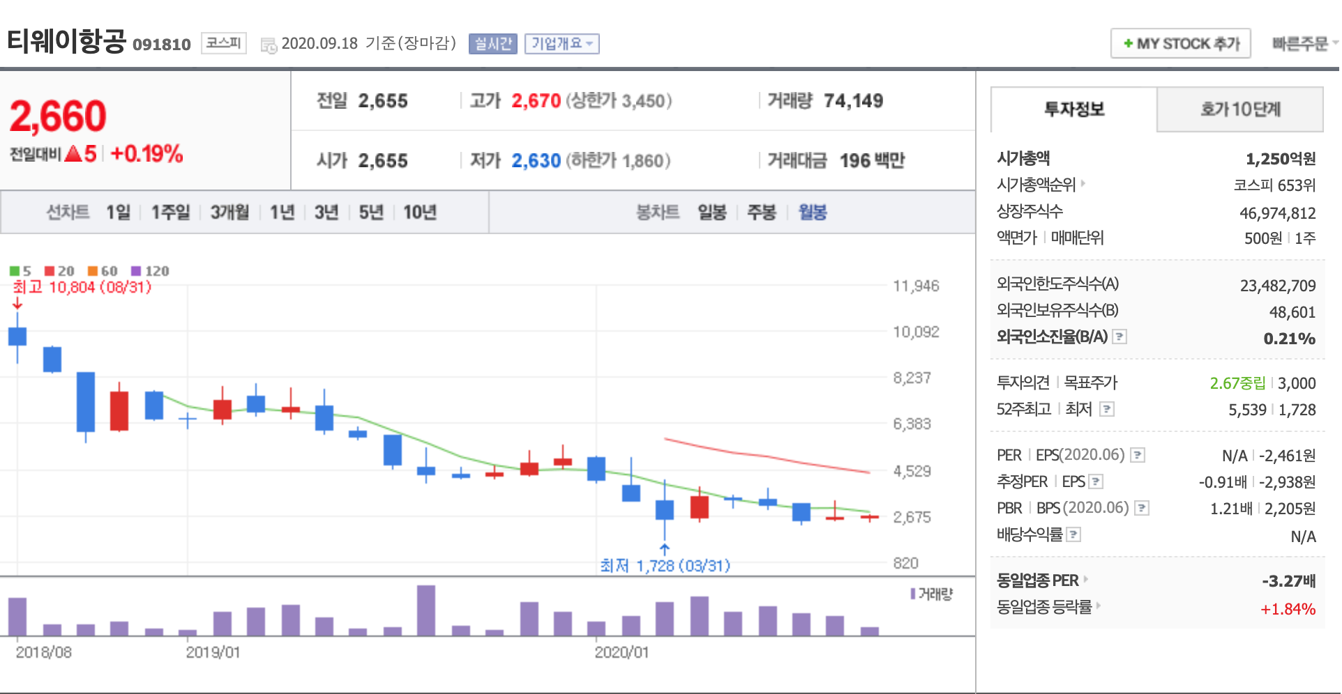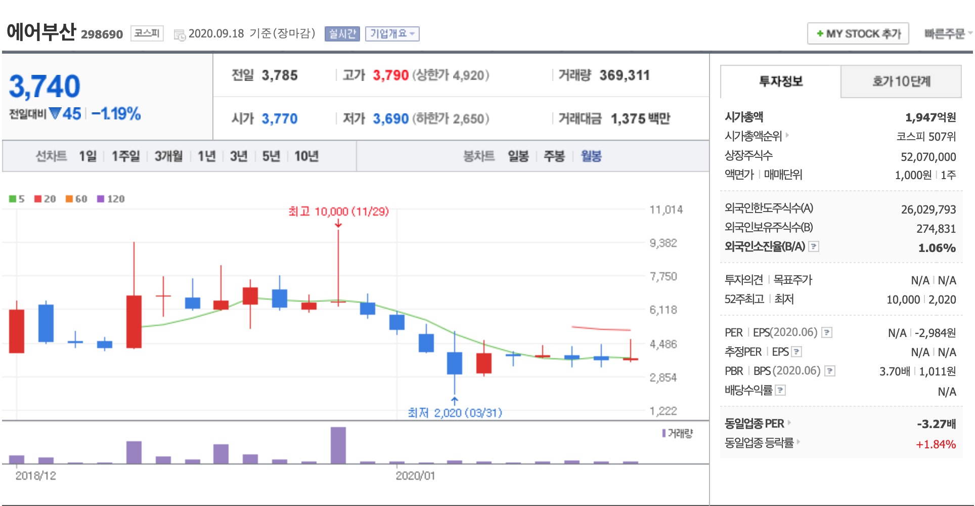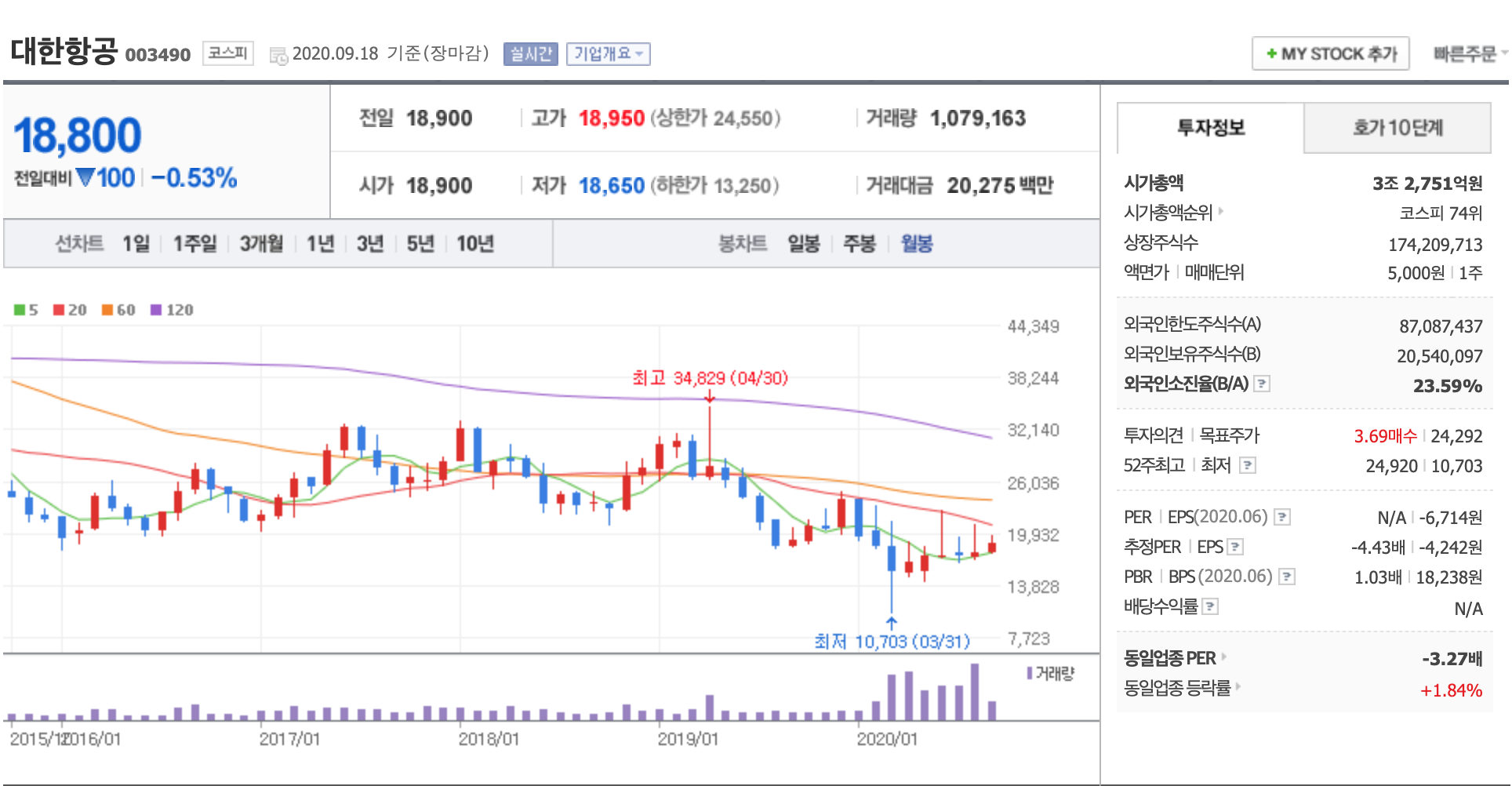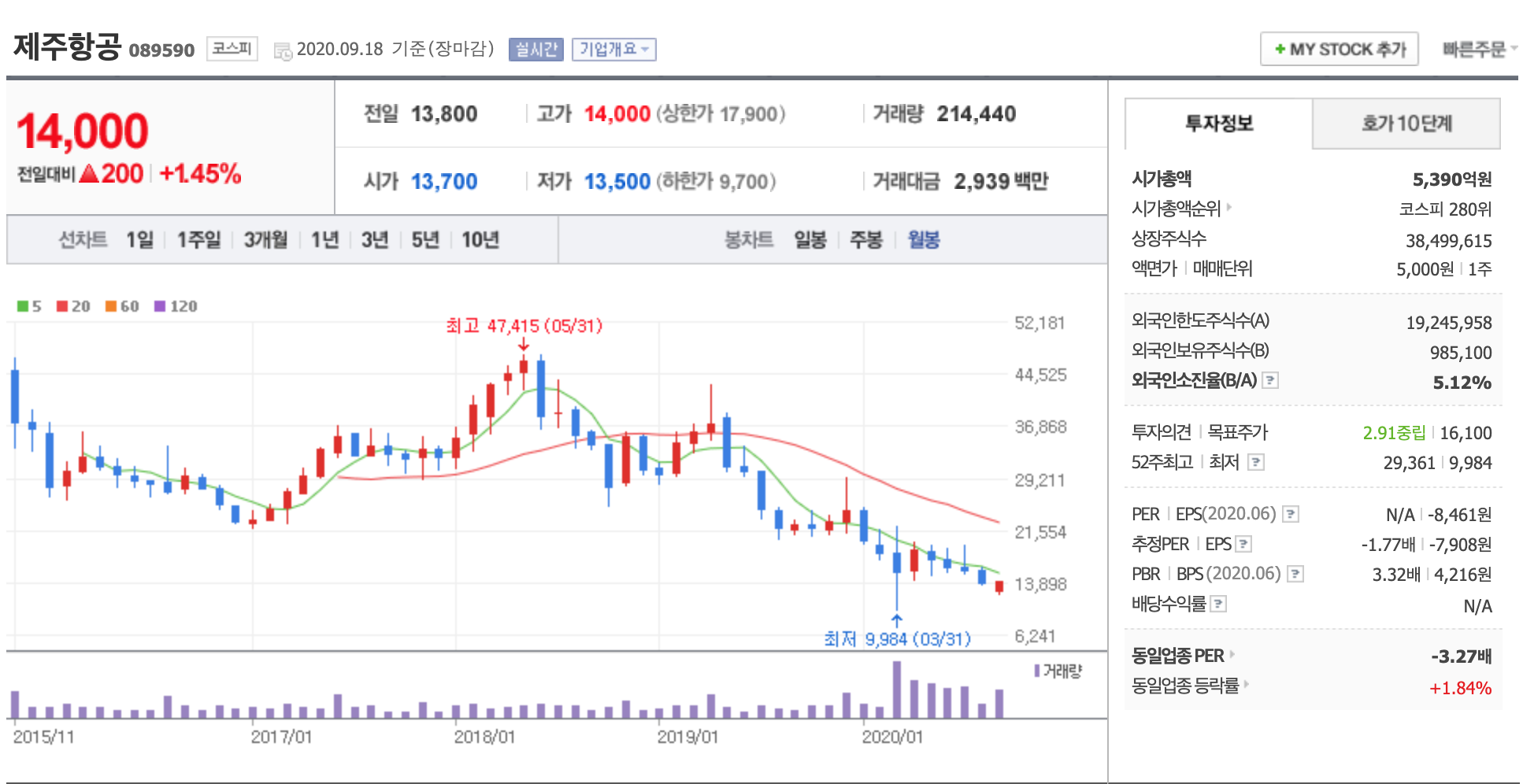 코로나의 여파로 항공주들의 연속된 불황으로 인해 주가가 많이 내려간 상황입니다.