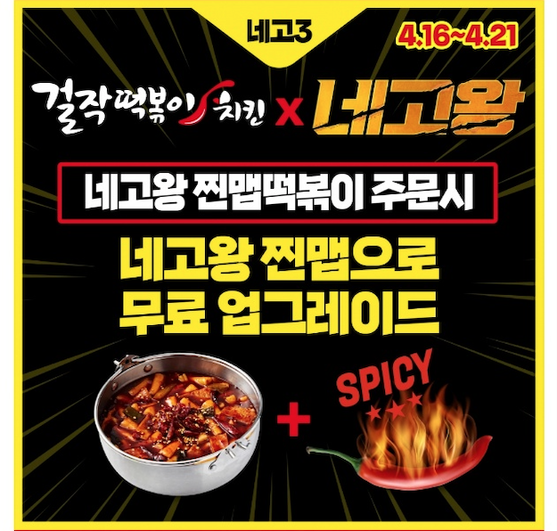 네고왕 찐맵떡볶이 주문시 네고왕 찐맵으로 무료 업그레이드 (04.16~04.21)