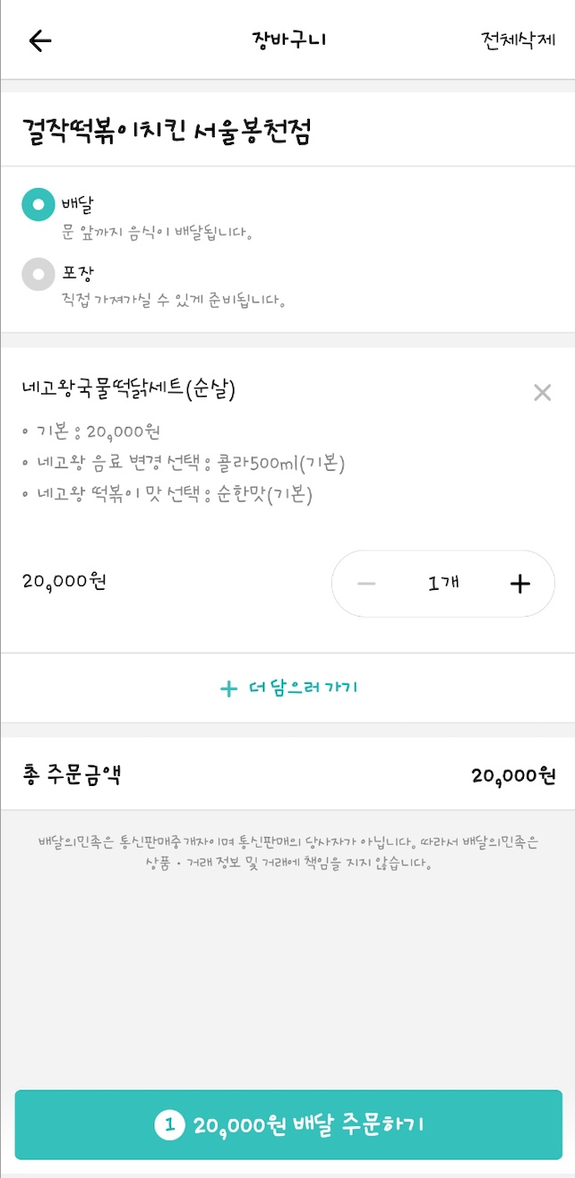 그래서 여유롭게 네고왕 국물 떡닭세트로 선택을 하고 장바구니에 넣고 주문을 하려고 했습니다.