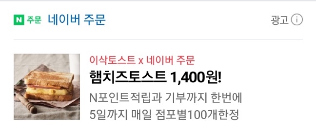 햄치즈 토스트 주문 시 N pay 포인트 적립도 해준다고 합니다. 새로운 사실을 알았네요. ㅎㅎ