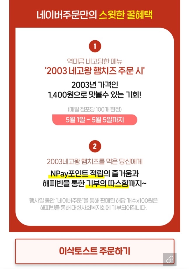 2003 네고왕 햄치즈 토스트 1,400원! (단, 네이버 주문을 통해 1인 1회로 한 매장 당 하루 100개 한정)
