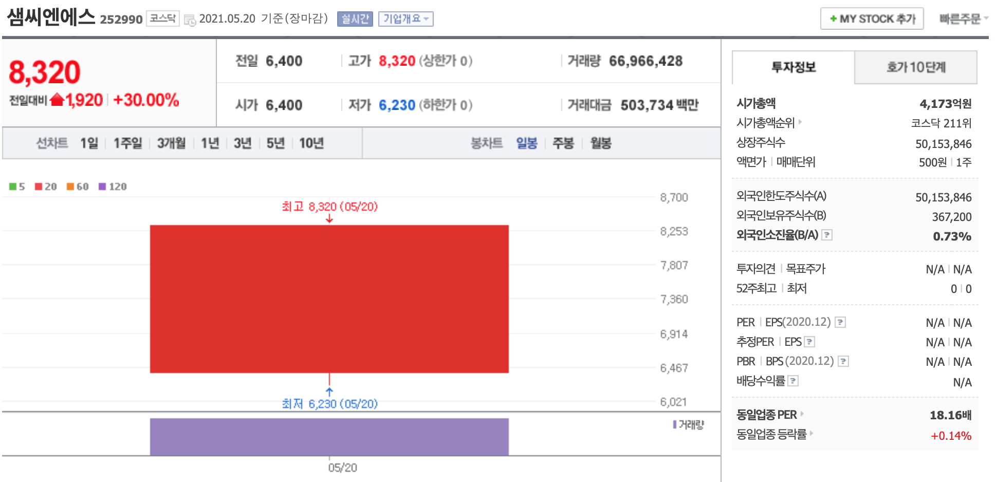 샘씨엔에스는 이날 공모가(6500원) 대비 소폭 낮은 6400원에 시초가를 형성했다. 공모주의 상장일 시초가는 공모가의 90~200% 범위에서 정해진다.