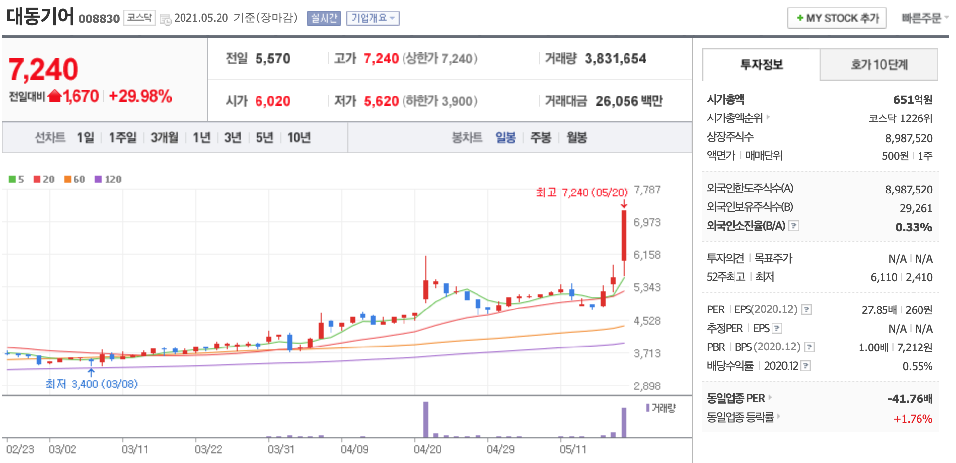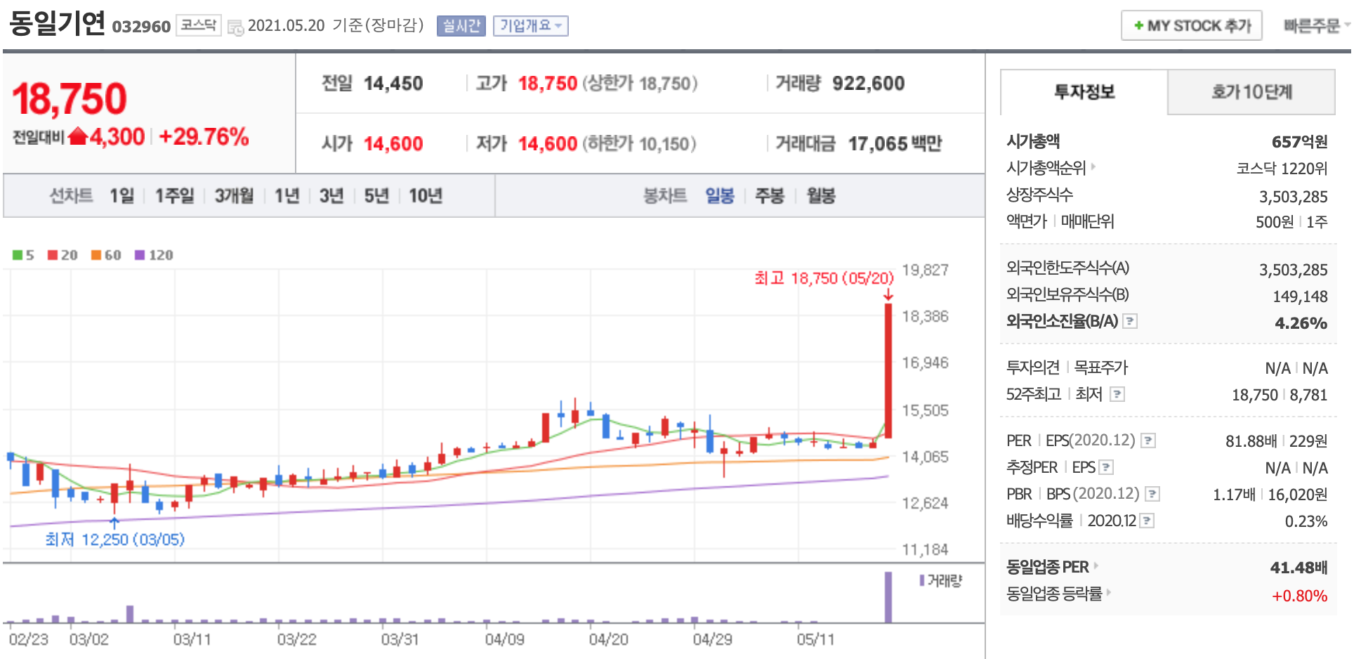 장 초반 시초가 대비 10%대 강세를 보이던 주가는 점차 올라 상한가로 장을 마쳤다.