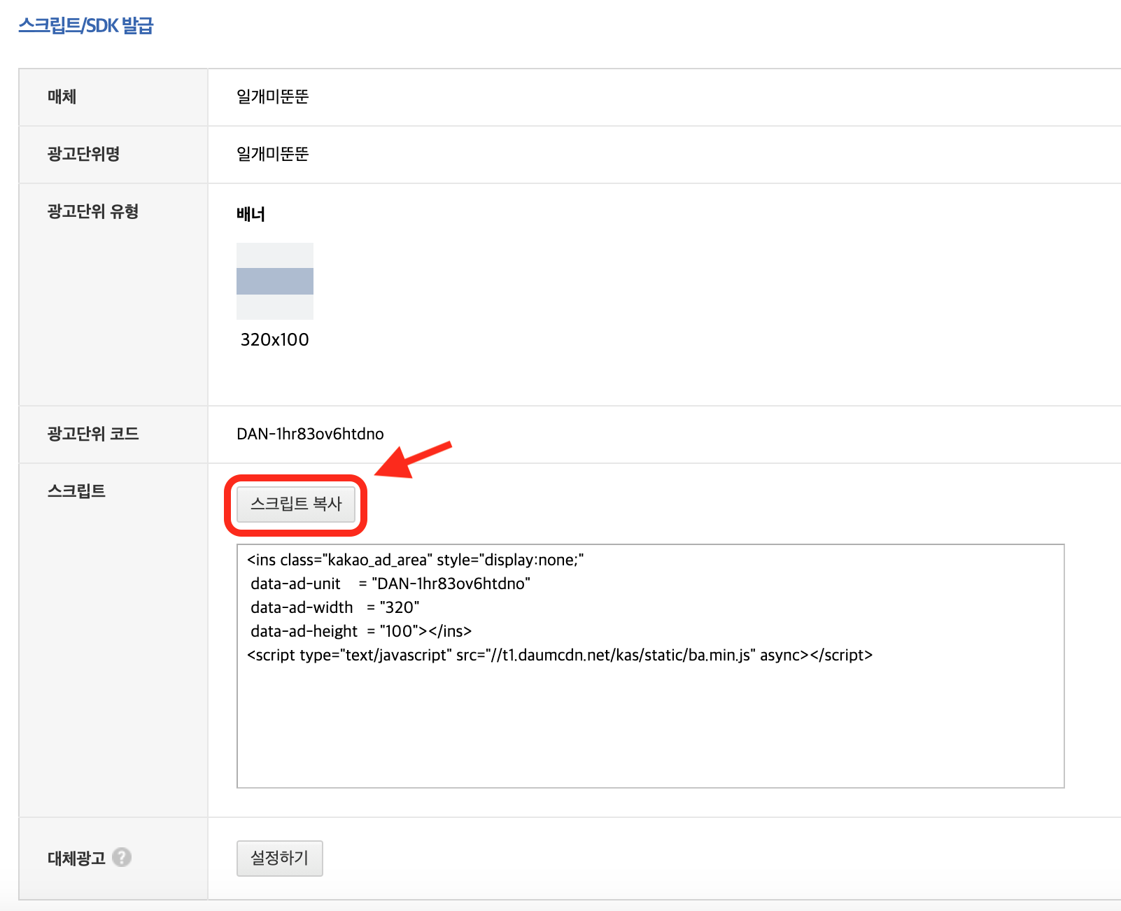 그러면 이런 화면이 보이실겁니다. head를 설정하기 위해 '스크립트 복사'를 클릭합니다.