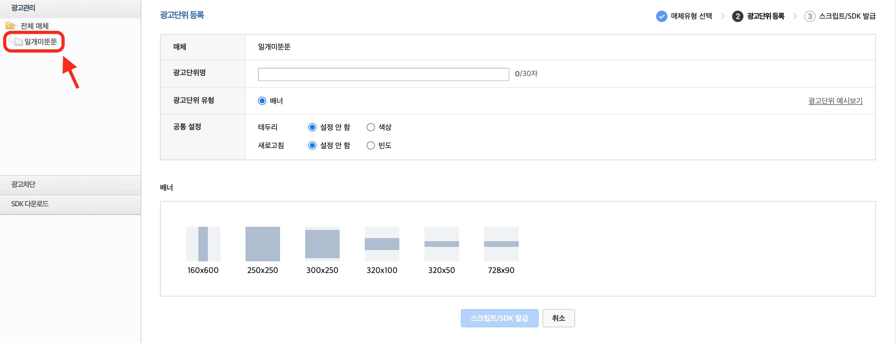 내가 구분할 수 있는 광고단위명을 설정해준 뒤 공통설정은 건드리지 않고 내가 필요한 배너를 선택해줍니다. 그 후 '스크립트/SDK 발급' 클릭합니다.