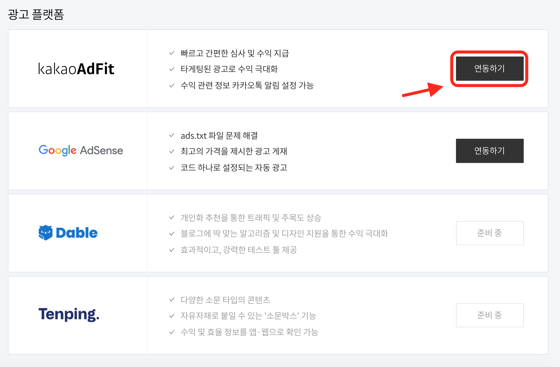 '수익'을 클릭하셔서 들어가시면 바로 옆에 Kakao AdFit 이라는 칸이 보이며 그 옆에 '연동하기'가 보이실 것입니다. 클릭해주세요!