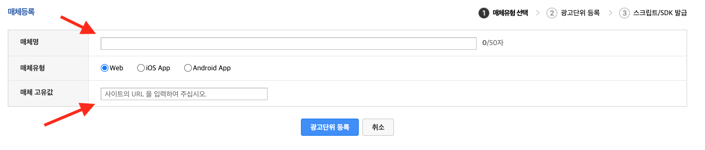 입력을 마치신 뒤 '광고단위 등록'을 클릭합니다.