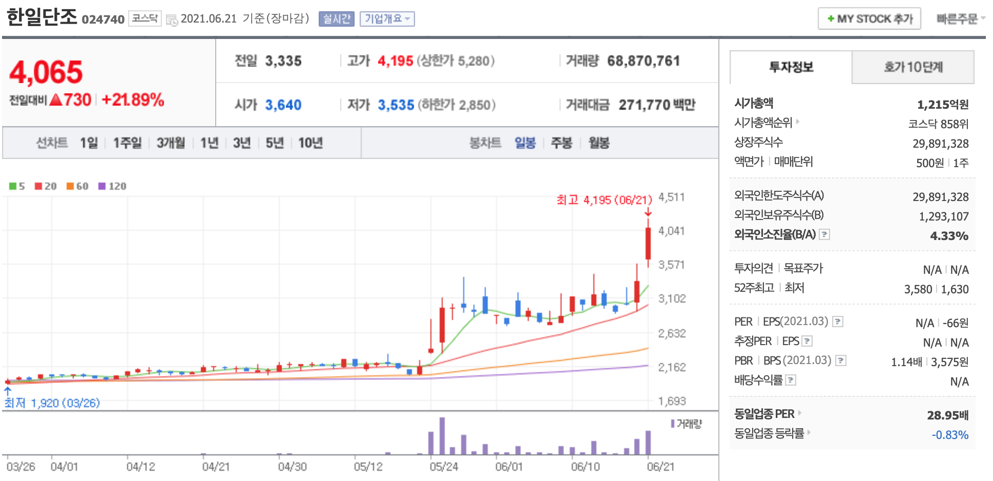 한일단조 주가가 상승세를 보이고 있다. 한일단조는 최재형 관련주로 지목된 바 있다.