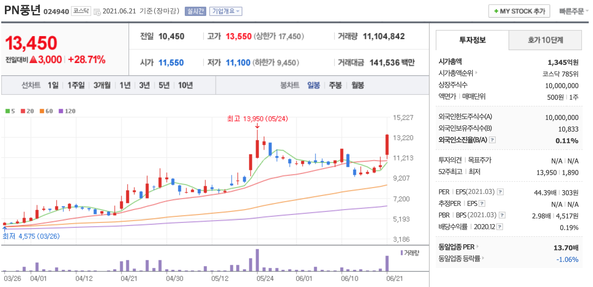 김동연 전 경제부총리 관련주로 불리는 PN풍년이 강세다.