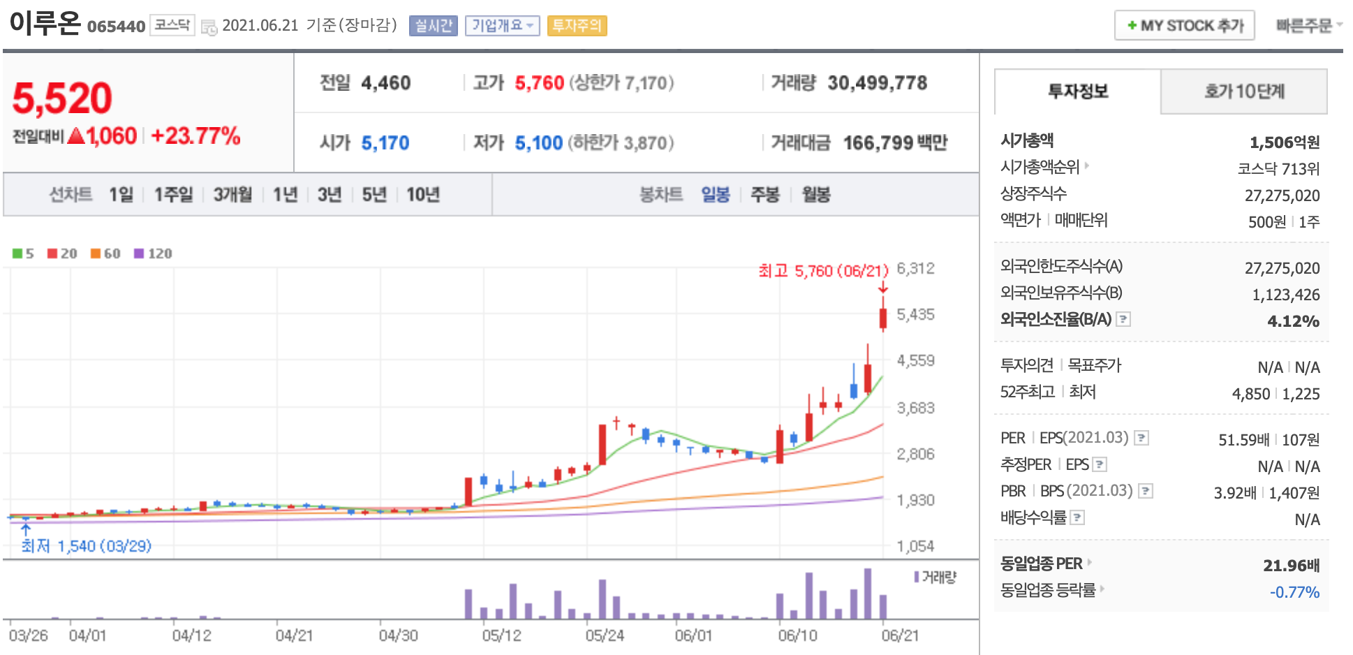 이루온 주가가 상승세다. 해당종목은 최재형 관련주로 언급된 바 있다.