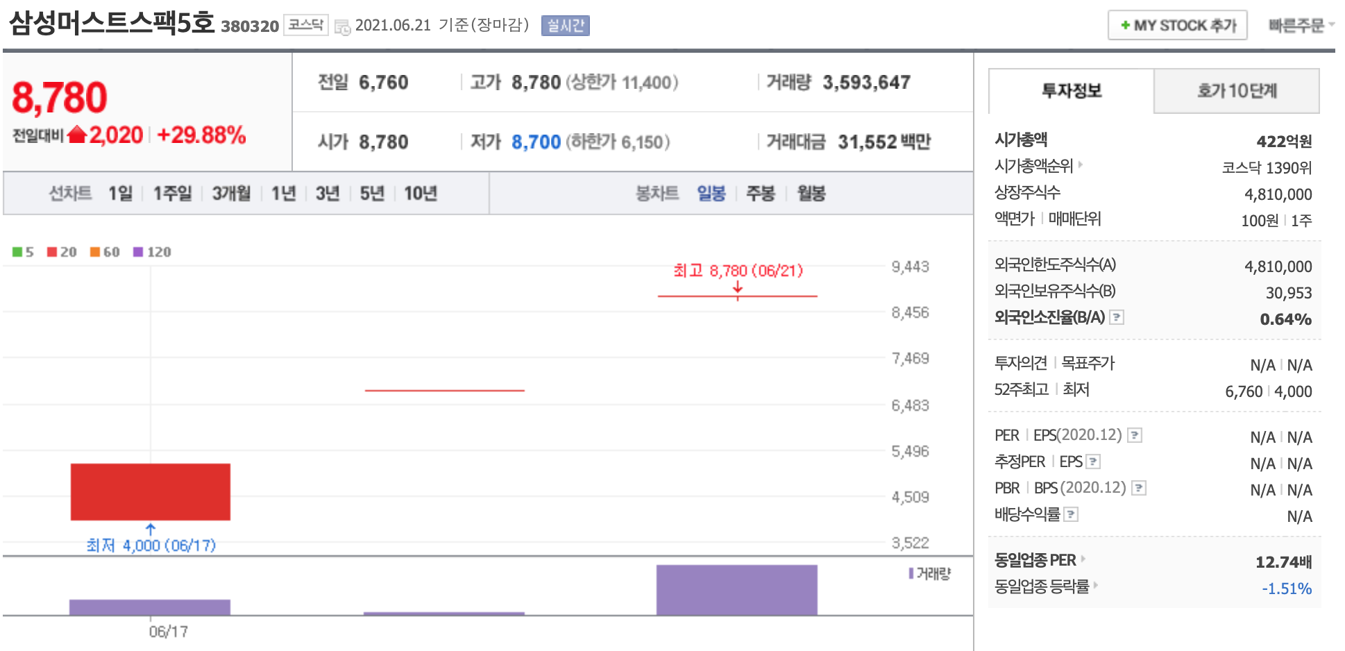 앞서 상장 첫 날인 17일 삼성머스트스팩5호는 시초가를 스팩 기준가인 2000원의 2배에 형성 후 상한가까지 올라 ‘따상’에 성공했다. 이후 18일에도 가격제한폭까지 올라 ‘따상상’에 성공했다.