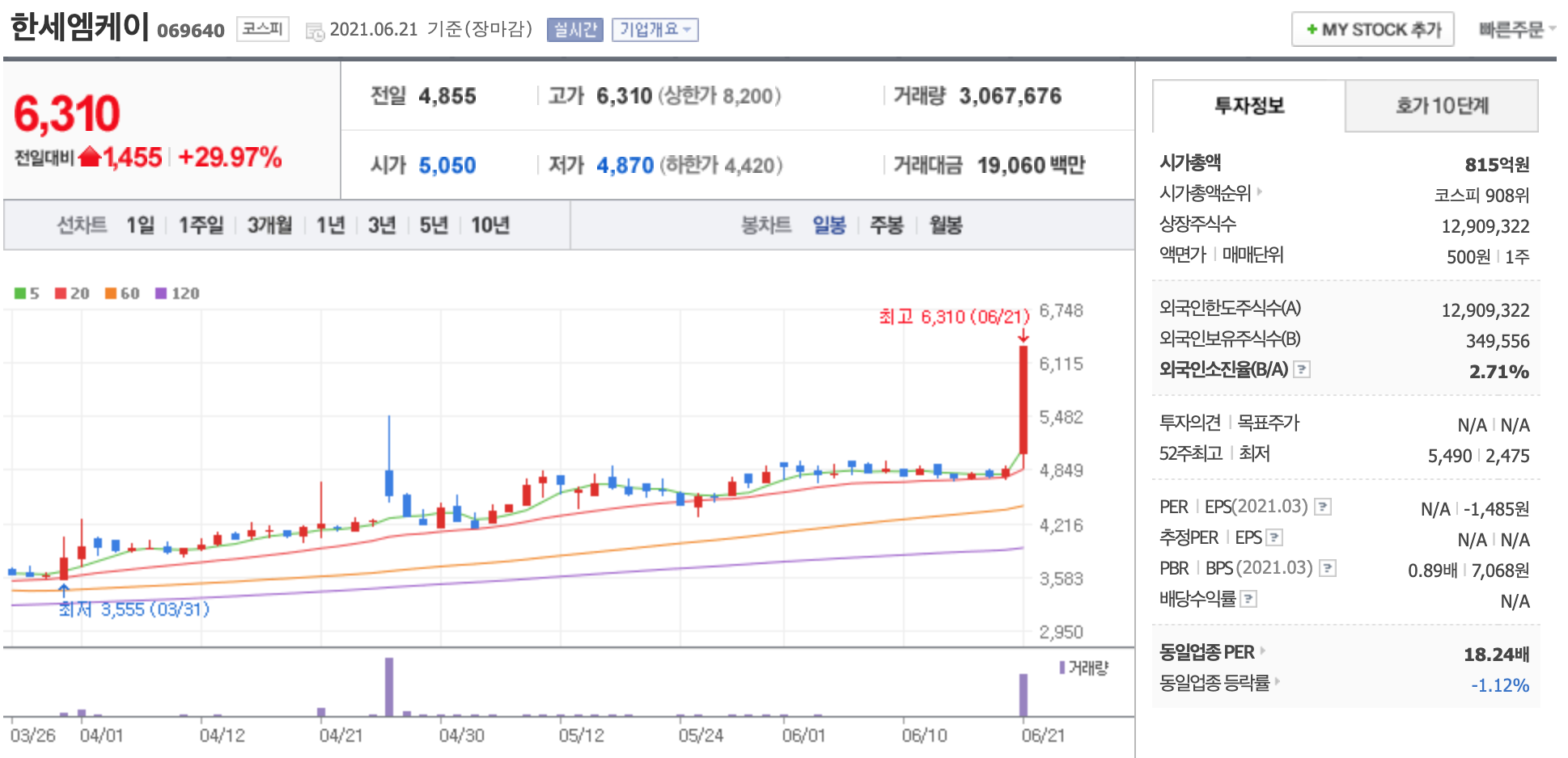한세엠케이가 급등세다. 한세엠케이는 최재형 관련주이다.