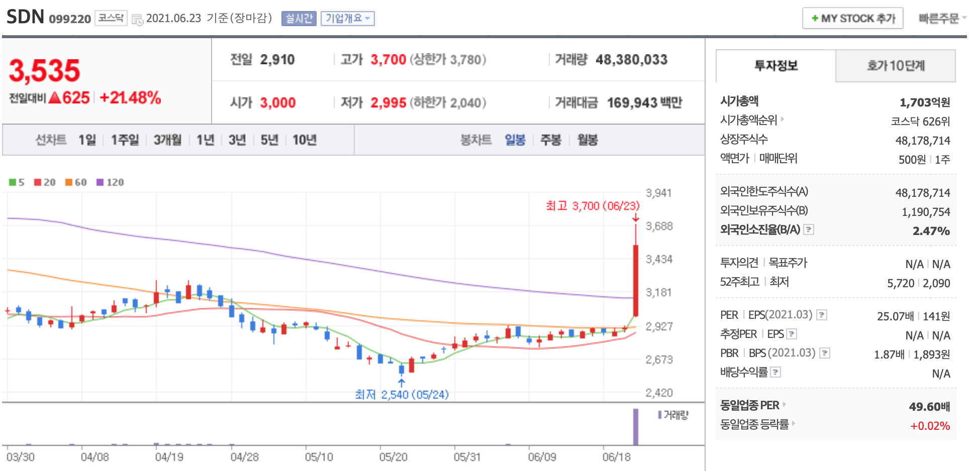 SDN 주가가 강세다. 최기혁 SDN 대표와 유승민 전 국민의힘 의원과 같은 위스콘신 주립대학원 출신이라는 점이 주가에 영향을 주는 것으로 보인다. 위스콘신 학연으로 엮인 대신정보통신과 삼일기업공사가 가격 제한폭까지 치솟으면서 SDN에 대한 관심도 커진 것으로 보인다.
