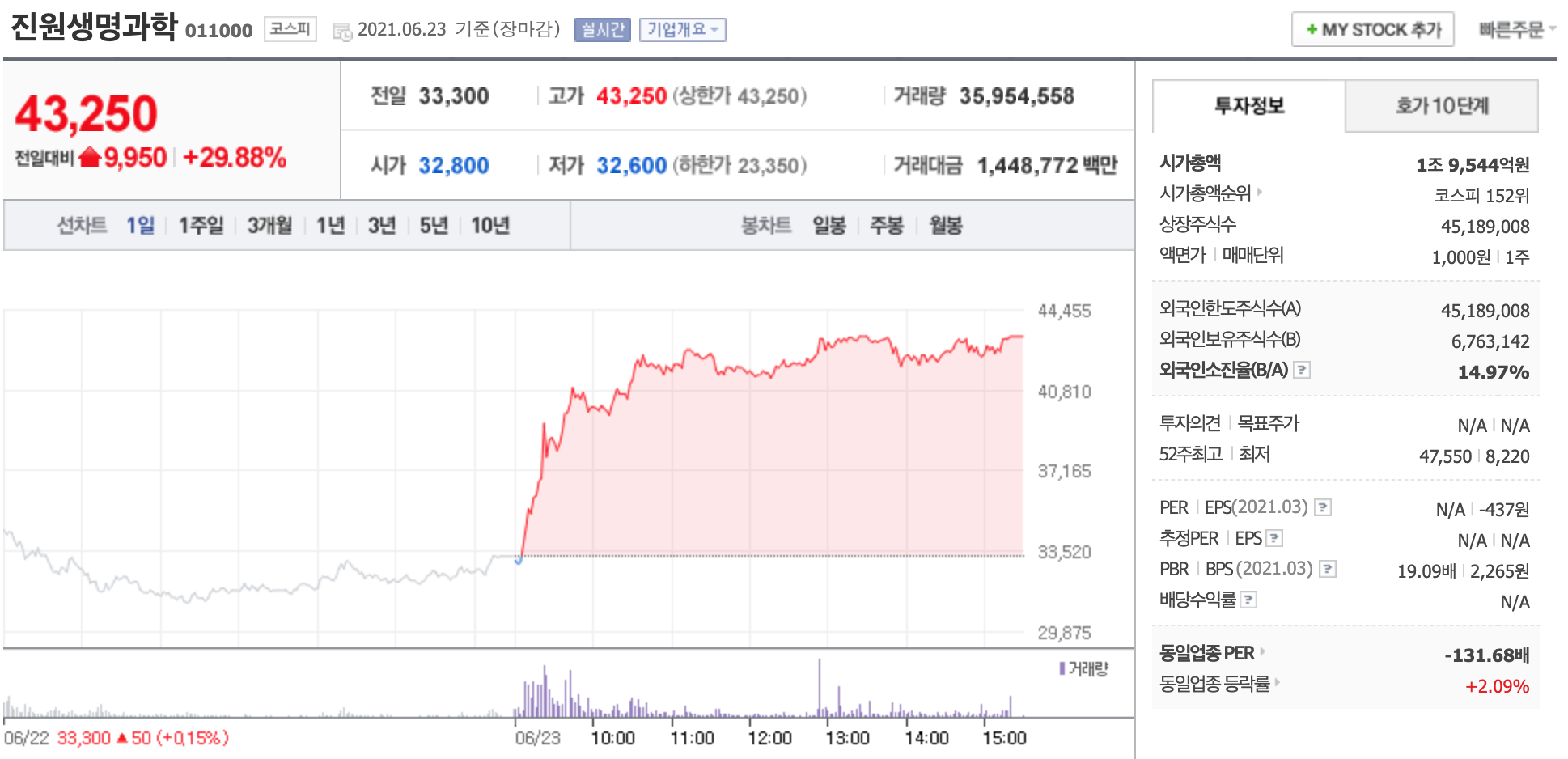 앞서 진원생명과학은 18일, 21일에도 기관이 이틀에 걸쳐 70억원대 순매수를 기록하면서 주가가 전일 대비 각각 6900원, 3300원까지 급등한 바 있다.