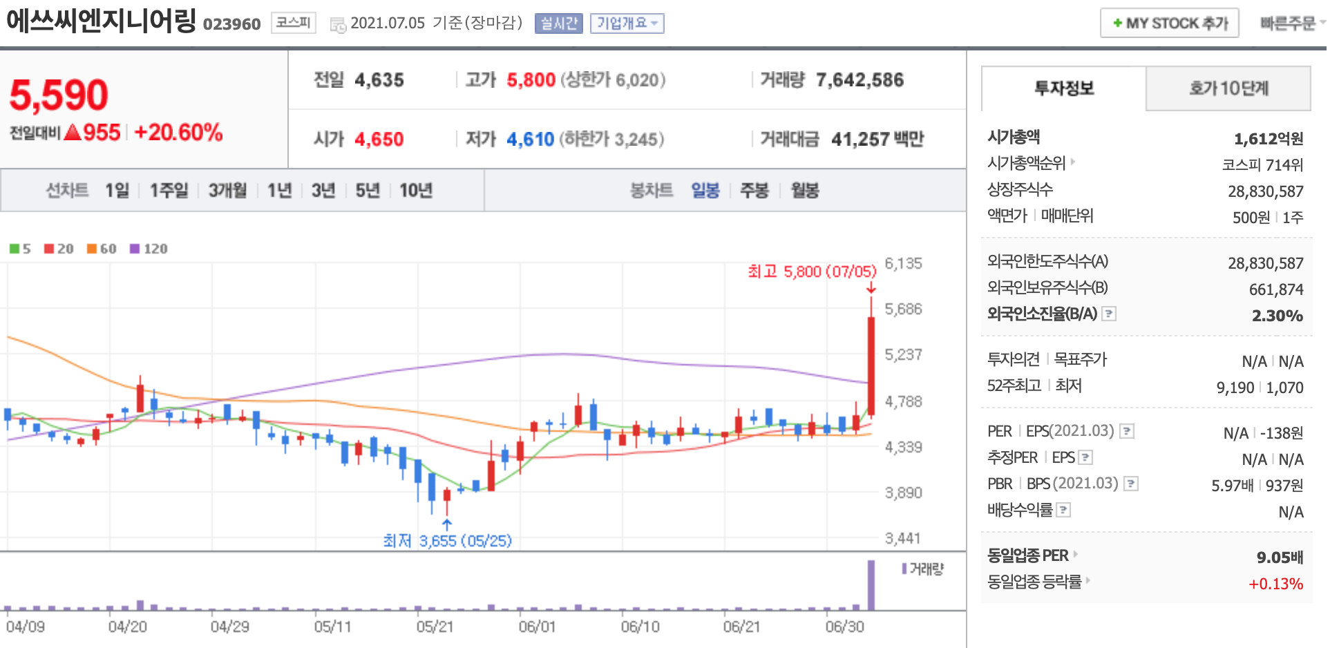 유진스팩5호는 인공지능(AI) 관제 시스템 통합 솔루션 기업 포커스에이치엔에스와 합병 상장한다는 소식에 급등한 것으로 해석된다. 지난 1일 포커스에이치엔에스는 유진스팩5호와 합병상장을 위한 한국거래소 예비심사를 통과했다고 밝힌 바 있다.