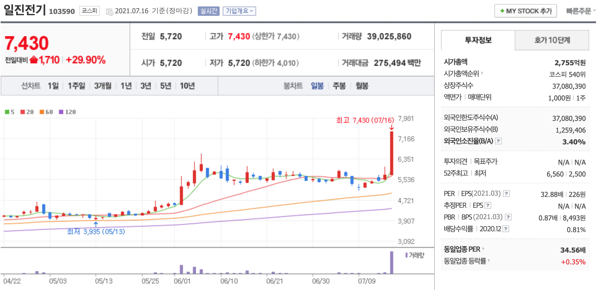 올여름 강력한 '열돔' 형태의 폭염이 찾아올 것으로 예고돼 전력대란에 따른 블랙아웃(대정전)이 우려 된다는 소식에 초고압 케이블과 초고압 변압기를 함께 생산하는 국내 유일 업체인 일진전기가 강세를 보이고 있다.